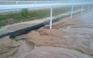 서울경마공원은 30일 새벽부터 집중된 폭우로 인해 일부 경주로가 침수돼 정상적인 경주가 어렵다고 판단, 토요일 12개 경주를 모두 취소했다. 경마공원 관계자는 "새벽에 내린 비로 경주로 모래가 상당부분 유실됐고, 바닥에 깔려있던 굵은 돌이 드러나 경주를 진행할 수 없는 상태"였다며 기수 및 조교사, 마주협회 등 관련단체 관계자들과 협의해 경주 중단을 결정했다고 설명했다. 서울경마공원은 경마취소로 인한 고객불편을 최소화하기 위해 제주경마공원에서 시행하는 9개 경주를 중계하고 있으며, 일요일 경주를 정상적으로 진행할 수 있도록 경주로 보수 작업을 펼치고 있다. 과천=류원근 기자 joongang.co.kr