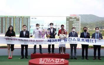 '제38회 일간스포츠배 대상경주'가 10일 오후 경기 과천시 서울경마공원에서 3년 만에 개최, 영광의 우승은 경주마 장산바다와 빅투아르 기수가 차지했다.우승을 차지한 빅투아르 기수가 시상식에서 가수 하이량, 정기환 한국마사회장으로부터 트로피와 꽃다발을 받고 있다.총 상금 2억원이 걸린 이번 경주는 2등급 이하 국산마들이 모여 1800m 최강자를 다퉜다.1983년 제1회를 시작으로 올해 38회째를 맞이한 일간스포츠배는 한국경마에서 가장 오래된 언론사배 대상경주라는 타이틀을 가지고 있다. 과천=김민규 기자 mgkim1@edaily.co.kr /2022.07.10/ 2022.07.10 17:32