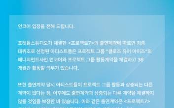JTBC ‘프로젝트7’ 최종 데뷔조 ‘클로즈 유어 아이즈’의 매니지먼트사가 출연계약 관련 공식입장을 내놨다. 16일 언코어는 클로즈 유어 아이즈 출연 계약 관련해 “포켓돌스튜디오가 체결한 ‘프로젝트7’의 출연 계약에 따르면 최종 데뷔조로 선정된 아티스트들은 프로젝트 그룹 클로즈 유어 아이즈의 매니지먼트사인 언코어와 프로젝트 그룹 활동계약을 체결하고 36개월간 활동할 의무가 있다”고 밝혔다. 이어 “출연계약 당시 아티스트들이 프로젝트 그룹 활동과 상충되는 다른 계약이 없다는 점, 이후에도 출연계약과 상충되는 다른 계약을 체결하지 않을 것임을 보장한 바 있다”며 “이와 같은 출연계약은 ‘프로젝트7’ 출연자 200명이 예외없이 동일한 조건으로 체결했다”고 설명했다. 언코어는 “하지만 포켓돌스튜디오는 아티스트들의 개별 활동에 관해 ‘프로젝트7’ 제작사에 사전에 고지했거나 제작사와 협의했으므로 이러한 활동이 허용된다고 주장하고 있다”며 “출연계약서의 해당 문구는 ‘프로젝트7’ 출연 이전에 불가피하게 계약을 체결한 경우 제작진과 협의 하에 해당 프로그램의 출연을 허락해서 아티스트들의 피해가 없도록 하는 조항이다. ‘프로젝트7’ 출연 중이나 그 이후에 최종 데뷔조 이외 다른 활동을 임의대로 해도 된다고 해석되는 계약이 아니며, 그럴 경우 명백한 계약 위반임을 말씀드린다”고 강조했다.이어 “나아가 포켓돌스튜디오는 ‘프로젝트7’ 제작사에게 아티스트들의 개별 활동 일정을 사전에 고지한 사실이 없고, 담당자가 일방적으로 요청했다 하더라도 제작사가 이를 허용한다는 의사를 전달한 사실이 없다”며 “‘클로즈 유어 아이즈’ 활동과 상충되는 아티스트들의 개별 활동은 출연계약을 위반하는 행위이며, 언코어는 손해배상을 포함한 책임을 물을 수밖에 없다”고 덧붙였다. <다음은 언코어(UNCORE) 입장 전문>언코어 입장을 전해 드립니다.포켓돌스튜디오가 체결한 <프로젝트7>의 출연계약에 따르면 최종 데뷔조로 선정된 아티스트들은 프로젝트 그룹 “클로즈 유어 아이즈”의 매니지먼트사인 언코어와 프로젝트 그룹 활동계약을 체결하고 36개월간 활동할 의무가 있습니다.또한 출연계약 당시 아티스트들이 프로젝트 그룹 활동과 상충되는 다른 계약이 없다는 점, 이후에도 출연계약과 상충되는 다른 계약을 체결하지 않을 것임을 보장한 바 있습니다. 이와 같은 출연계약은 <프로젝트7> 출연자 200명이 예외없이 동일한 조건으로 체결하였습니다.하지만 포켓돌스튜디오는 아티스트들의 개별 활동에 관해 <프로젝트7> 제작사에 사전에 고지했거나 제작사와 협의하였으므로 이러한 활동이 허용된다고 주장하고 있습니다. 출연계약서의 해당 문구는 <프로젝트7> 출연 이전에 불가피하게 계약을 체결한 경우 제작진과 협의 하에 해당 프로그램의 출연을 허락해서 아티스트들의 피해가 없도록 하는 조항입니다. <프로젝트7> 출연 중이나 그 이후에 최종 데뷔조 이외 다른 활동을 임의대로 해도 된다고 해석되는 계약이 아니며, 그럴 경우 명백한 계약 위반임을 말씀드립니다.나아가 포켓돌스튜디오는 <프로젝트7> 제작사에게 아티스트들의 개별 활동 일정을 사전에 고지한 사실이 없고, 담당자가 일방적으로 요청했다 하더라도 제작사가 이를 허용한다는 의사를 전달한 사실이 없습니다.“클로즈 유어 아이즈” 활동과 상충되는 아티스트들의 개별 활동은 출연계약을 위반하는 행위이며, 언코어는 손해배상을 포함한 책임을 물을 수밖에 없습니다.특히 공정성이 중요한 공개 오디션에서 처음 시작 시점과 달라진 포켓돌스튜디오의 별도 요구에 대해 협의하는 것은 198명의 다른 참가자와 그 가족들 및 관계자들에게는 공정성의 훼손이며, 모든 관련자들에게 직간접적인 피해를 준다는 점 말씀드립니다다수의 오디션 프로그램 제작과 아티스트 매니지먼트를 담당한 경험이 있는 포켓돌스튜디오는 “클로즈 유어 아이즈”가 실제로 데뷔에 이르기까지 얼마나 많은 노력과 시간이 투입되어야 하는지, 데뷔를 앞둔 아티스트들의 개별 활동이 “클로즈 유어 아이즈”의 향후 활동에 얼마나 중대한 영향을 미칠지 잘 알고 있을 것이라 생각합니다.“클로즈 유어 아이즈”의 일원으로 성공적인 활동을 이어가고 싶은 아티스트 본인의 의지와 부모님들의 바람, 팬들의 성원에 귀 기울여 주시기 바랍니다. 수익을 분배 받는 포켓돌스튜디오의 이익에도 부합하는 만큼, “클로즈 유어 아이즈” 활동에 전념할 수 있도록 적극적으로 협조하여 주실 것을 다시 한 번 요청 드립니다.박세연 기자 psyon@edaily.co.kr
