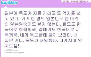 소설가 이외수가 일본 정부의 '독도 망발'에 따끔한 일침을 가했다. 이외수는 30일 일본 정부가 독도 영유권 주장을 강화한 중학교과서 검정결과를 공개하자 자신의 트위터에 "다케시마 엿 처드셈"이라는 다소 거친 표현을 써가며 반박했다. 이외수는 "일본이 독도가 지들 거라고 또 억지를 쓰고 있다. 거기 한 명의 일본인도 한 마리의 일본원숭이도 살지 않는다"고 말문을 열었다. 이어 "파도도 한국어로 철썩철썩, 갈매기도 한국어로 끼룩끼룩. 내가 독도한테 물어 보았다. 너 일본 거냐. 독도가 대답했다. 다케시마 엿 처드셈"이라며 일본 정부를 맹비난했다.네티즌은 "속이 정말 시원하다" "이외수 선생님 멋지다" "대지진과 쓰나미 피해로 일본이 안쓰러웠는데 지금은 분노가 치밀어오른다" 등 다양한 의견을 쏟아냈다. 이날 일본 정부는 독도는 일본의 고유영토이고 우리나라가 '불법점거'하고 있다는 억지 주장을 담은 중학교과서들이 문부과학성 검정을 통과한 사실을 공개했다.권오용 기자 2011.03.30 20:17