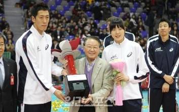 13-14프로배구 V리그 올스타전이 19일 오후 수원실내체육관에서 열렸다. 우승을 차지한 K스타팀 윤봉우와 양효진이 구자준 총재와 우승트로피를 들고 포즈를 취하고 있다. 수원=김민규 기자 mgkim@joongang.co.kr 2014.01.19 16:47