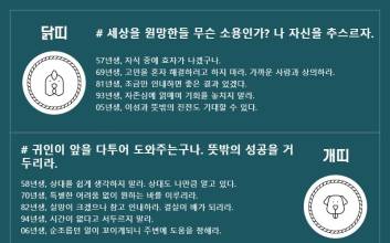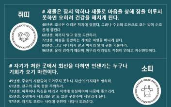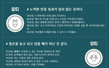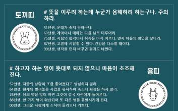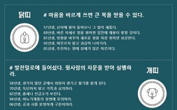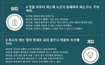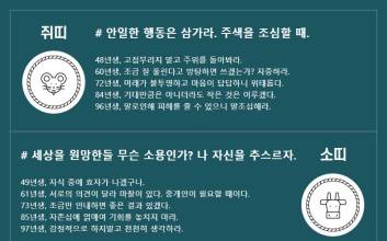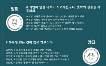 자료제공 : 점신 쥐띠 # 모든 일에는 이치가 있는 법. 순리에 역행하지 마라. 48년생, 과욕을 부리지 않으면 순탄히 성사된다. 60년생, 정신은 풍요한데 물질은 빈곤하구나. 72년생, 동북방에 귀인과 제물이 있다. 84년생, 오늘 하루는 아무 근심없이 지나게 되리라. 96년생, 주변의 잘못이 있을 때에는 과감하게 지적을 해라. 소띠 # 뜻을 이루려 하는데 누군가 음해하려 하는구나. 주의하라. 49년생, 운대가 좋지 못하구나. 61년생, 계약이나 매매는 다음 날로 미루어라. 73년생, 시험의 합격이나 취직은 아직 이르다. 먼저 마음의 평안을 찾자. 85년생, 고열에 시달릴 수 있다. 건강을 다스릴 때이다. 97년생, 문서나 계약에 주의해라. 범띠 # 하고자 하는 일이 뜻대로 되지 않으니 마음이 초조해진다. 50년생, 지금의 상황이 조금 좋아졌다고 방심하지 말라. 62년생, 현재의 벌려놓은 사업을 유지하며 축소나 확장은 하지 말라. 74년생, 남의 말을 많이 하면 그것이 결국 자신에게 돌아온다. 86년생, 한 가지 병이 확산되어 또 다른 병을 유발시키게 된다. 98년생, 자신의 이름에 자긍심을 가져라. 토끼띠 # 원대한 포부와 크나큰 꿈이 있어 활기차게 새로운 일에 도전하려하나 사방이 험한 산들이 가로 막혀있다. 51년생, 소망이 남달리 큰 탓이라, 쉽게 이루어지기는 어렵겠다. 63년생, 갖가지 방법을 동원하여 역경을 물리치기는 하나 결실은 만족치 못하다. 75년생, 오래 전 당한 사고의 후유증이 발병할 조짐이 있다. 87년생, 심기를 안정시키고 기다리는 것이 상책이라 하겠다. 99년생, 자신보다 힘없는 사람에게 예의있게 행동하라. 용띠 # 재물은 잠시 막히나 재물로 마음을 상해 잠을 이루지 못하면 오히려 건강을 해치게 된다. 52년생, 조금은 어려운 처지에 있겠다. 그러나 주위의 도움으로 모든 일이 순조롭게 풀린다. 64년생, 아끼지 말고 힘껏 도전하라. 76년생, 이성을 동반하는 가벼운 여행을 떠나게 된다. 88년생, 그냥 지나치지 말고 주위의 말에 귀를 기울여라. 00년생, 집중력이 필요한 하루이다. 충동적으로 행동하지마라. 뱀띠 # 자기가 처한 곳에서 최선을 다하면 언젠가는 누구나 기회가 오기 마련이다. 53년생, 주위의 사람들이 도와주지 못하니 자신의 의지대로 행하라. 65년생, 친구의 유혹 등을 주의하라. 77년생, 허욕이나 욕심을 버리고 직책에 충실하여야 나중에 좋으리라. 89년생, 주위에서 시끄러운 말 등 많은 구설수에 시달리게 된다. 01년생, 꼬임이나 유혹에 주의해라. 말띠 # 노력한 만큼 성과가 있지 않는 운이다. 54년생, 노력하지만 보람 없이 무너진다. 66년생, 재난과 수난을 겪게 되니 수심만 가득하다 하겠다. 78년생, 항상 생활에 안정치 못하고 불안하고 위태위태하다. 90년생, 꿈도 크고 이루어지길 간절히 바라지만 기대만 컸을 뿐 이루어지지 않는다. 02년생, 이성에게 오해를 받을 수 있으니 주의해라. 양띠 # 일손을 놓고 쉬고 있을 때가 아닌 것 같다. 55년생, 때때로 운동할 수 있는 여건을 마련하도록 하라. 67년생, 동쪽에서 양심 있는 사람으로부터 연락이 온다. 79년생, 하는 사업이 차차 진전이 있다. 91년생, 희망을 버리지 말라 곧 좋은 소식이 오게된다. 03년생, 호기심이 넘치는 것에 주의해라. 원숭이띠 # 앞뒤를 잘 가려야 성공할 수 있다. 56년생, 소송은 불길하다. 타협하라. 68년생, 주위 상황을 주시하고 보조를 맞추자. 80년생, 이성과의 불화가 걱정되니 신중하게 결정하라. 92년생, 소중한 물건을 잃어버린다. 서쪽이 길한 방향이다. 04년생, 비교하지말고 기초를 더 다져라. 닭띠 # 마음을 바르게 쓰면 큰 복을 받을 수 있다. 57년생, 산야에 봄이 돌아오니 그 빛이 새롭다. 69년생, 바른 자세로 일을 꾀하면 집안에 재물이 쌓일 것이다. 81년생, 방향을 바꾸어 새로운 일을 차장 취하면 성공한다. 93년생, 머무르지 말고 과감히 나아가라. 05년생, 추진하는 일에 장애가 많은 하루이다. 개띠 # 발전일로에 들어섰다. 윗사람의 자문을 받아 실행하라. 58년생, 생각지 않던 곳에서 희망이 생기고 활기를 찾게 된다. 70년생, 독단하지 말고 가족과 상의하라. 82년생, 출세나 진급수가 보인다. 94년생, 비뇨기계통의 질병에 유의하라. 06년생, 공과 사를 분명하게 구분지어라. 돼지띠 # 특이한 지혜와 재치로 만인의 사랑을 받게 된다. 59년생, 상대의 변덕이 심해 앞을 내다보기가 힘들구나. 71년생, 흑백을 가리기는 힘들다. 작당한 선에서 타협하라. 83년생, 일복이 많아 건강을 잃을 수 있으니 쉬었다 가라. 95년생, 사랑하는 이가 있으나 부모들이 반대하는구나. 07년생, 주변의 불필요한 시비에 휘말리지 마라.