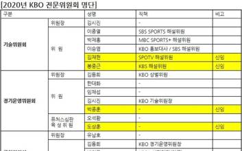 김재현, 봉중근 해설위원이 신임 기술위원으로 합류하는 등 KBO가 2020년 전문위원회 구성을 마쳤다. 국가대표팀 기술위원회는 김시진 위원장을 비롯해 이종열(SBS스포츠 해설위원)·박재홍(MBC스포츠플러스 해설위원)·이승엽 KBO 홍보대사가 연임하고, 여기에 김재현(SPOTV 해설위원)·봉중근 (KBS 해설위원)이 신임 기술위원으로 합류해 2020 도쿄 올림픽에 대비한다. 김재현 위원은 국가대표팀 코칭스태프로서 국가대표팀 선수들을 지도한 바 있고, 봉중근 위원은 국제무대에서의 활약과 풍부한 경험을 바탕으로 국가대표팀 전력분석원으로 활동한 바 있다. 경기 운영위원회는 김용희 위원장과 김시진·한대화·임채섭 위원이 연임하고 박종훈 전 한화이글스 단장이 신임 위원으로 위촉됐다. 퓨처스심판육성위원은 기존 오석환 위원과 함께 도상훈 전 KBO 심판위원장이 신임 위원을 맡게 됐다. 규칙위원회는 유남호 위원장을 비롯해 KBO 경기 운영위원장, 심판위원장, 기록위원장과 대한야구소프트볼협회 야구 심판팀장(박휘용)으로 구성된다. 이에 따라 올해 선임된 허운 심판위원장과 김태선 기록위원장이 신임 위원으로 활동하게 된다. 상벌위원회는 최원현 위원장(법무법인 KCL 대표 변호사)과 민경삼 KBO 자문위원, 김용희 경기 운영위원장이 연임하고, 김재훈 변호사(김재훈 법률사무소 대표 변호사)와 김기범 교수(경찰대학교 경찰학과 교수)가 신임 위원으로 위촉됐다. 이형석 기자