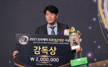 KT가 수원 케이티위즈파크에서 열린 SSG 랜더스와의 경기에 앞서 이강철 감독의 통산 200승을 기념하는 축하 행사를 개최했다. 2019시즌을 앞두고 KT 3대 감독으로 부임한 이 감독은 이듬해 팀을 정규시즌 2위에 올려놓으며, 구단 역사상 첫 포스트시즌 진출을 이끌었다. 지난해 7월 11일 수원 삼성전에서 통산 100승을 달성했고, 지난 8월 15일 수원 삼성전 승리로 369경기 만에 통산 200승 고지를 밟았다. KBO리그 역대 31번째 감독 통산 200승이자, 구단 역사상 최초의 기록이다. 구단은 25일 이 감독의 통산 200승 기념 행사를 열어 기념구와 사진 액자, 꽃다발을 선물했다. 이 감독의 200승을 축하하는 깜짝 영상 편지도 상영했다. 무관중 지침으로 야구장을 찾지 못하는 팬들은 ‘언택트 Live’를 통해 200승 행사를 함께 했다. 이 감독의 은사인 김응용 전 대한소프트볼협회 회장도 영상에 깜짝 등장했다. 김 전 회장은 "이강철 감독의 200승을 축하한다. 차분한 경기 운영을 보면서 나도 이 감독에게 배우고 있다. 좋은 선수였는데, 좋은 감독이 됐다"면서 “나를 뛰어넘는 감독이 되길 바란다. 한국시리즈에서 나보다 더 많은 승수를 쌓고, 올 시즌 우승하길 응원한다"라고 밝혔다. 이강철 감독은 "축하해주신 팬들과 함께 땀 흘려준 선수, 남상봉 사장님과 구단 프런트, 그리고 구현모 대표이사님께 진심으로 감사드린다. 감독의 승수는 선수들이 만들어줬으며, 나는 기록의 수혜자일 뿐이다. 선수들에게 고맙다. 또 저를 지도해주신 감독님들과 KT 역대 감독이신 조범현 감독님, 김진욱 감독님께도 감사를 전하고 싶다"라고 전했다. 수원=안희수 기자 an.heesoo@joongang.co.kr
