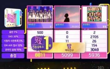 걸그룹 여자친구가 '인기가요'까지 음악방송 1위 트로피를 추가했다.여자친구는 13일 SBS '인기가요'에서 5월 둘째주 1위로 호명됐다. 닐로 '지나오다', 모모랜드 '뿜뿜'을 제치고 1위에 등극했다. 지난 4월 30일 발매된 여자친구의 '밤'은 격정적이면서도 아련한 컨셉트를 내세워 사랑받고 있다.이날 트로피를 안은 여자친구는 "버디(팬클럽) 여러분들께 고맙고 고생하신 스태프들에게도 감사드린다"며 "이 상이 너무 소중하다. 앞으로 열심히 노력하겠다"고 밝혔다.'인기가요'에서는 컴백무대로 용준형, 틴탑, 크로스진, 벤, 드림캐쳐를 마련했다. 하이라이트 용준형은 솔로 첫 정규 타이틀곡 ‘무슨 말이 필요해’로 감성 매력을 보였다. 틴탑 역시 신곡 ‘서울밤’으로 특유의 경쾌함을 어필했다. 5인 체제로 팀을 리부팅한 보이그룹 크로스진은 다섯번째 미니앨범 ‘ZERO’의 타이틀곡 ‘달랑말랑’으로 컴백했다. ‘달랑말랑’은 남녀간 미묘한 사랑의 시작을 알리며 ‘밀당’의 신선함을 표현한 트로피컬 사운드의 R&B 곡으로 크로스진의 카리스마를 담았다.컴백 라인업에 함류한 벤은 첫 정규앨범 타이틀곡 ‘열애중’을 불렀다. ‘열애중’은 이별 이후에도 현재 진행 중인 사랑에 대한 씁쓸한 마음을 담은 곡이다. 드림캐쳐도 메탈 록 장르의 ‘YOU AND I’로 파워 댄스를 선사했다. 이밖에도 위너, 러블리즈, 여자친구, 스누퍼, 임팩트, 나윤권, 펜타곤, 오마이걸반하나, IN2IT, (여자)아이들, 더보이즈, 아이즈 등이 출연했다. 황지영기자 hwang.jeeyoung@jtbc.co.kr