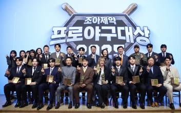 (주)조아제약과 일간스포츠가 공동제정한 '2025 조아제약 프로야구 대상' 시상식이 2일 오전 서울 강남구 라움아트센터에서 열렸다. 시상식 후 시상자 및 수상자들이 단체 기념촬영을 하고 있다. 국내 최고의 권위를 자랑하는 일간스포츠-조아제약 프로야구 대상은 1977년 출범 이후 48년의 역사를 이어온 명실상부 국내 최고의 프로야구 시상식이다. 올해 시상식은 전통 시상식의 틀을 뛰어넘어, 팬들이 참여하는 토크쇼, 특별사인회 등 다채로운 행사로 거듭났다. 특별취재단/2025.12.02/ 2025.12.02 12:05