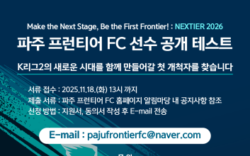 K리그2 무대에 새롭게 도전하는 파주 프런티어 FC가 2026시즌을 앞두고 선수 공개테스트를 진행한다.구단은 이번 테스트를 통해 창단 첫 시즌의 주역이자 K리그2의 새로운 시대를 함께 열어갈 ‘첫 개척자(Frontier)’를 선발하고, 과학적 데이터 기반의 평가 시스템을 도입해 선발 과정의 공정성과 객관성을 높일 계획이다.황보관 파주 프런티어 FC 단장은 “이번 공개테스트는 단순한 선발 절차가 아니라, K리그2의 새로운 무대를 함께 만들어갈 진정한 프런티어를 찾는 과정”이라며 “파주를 중심으로 젊은 선수들이 성장과 기회의 플랫폼을 경험하길 바란다”고 밝혔다.공개테스트는 2025년 11월 22일(토)과 23일(일) 양일간 파주NFC 백호구장과 청운구장에서 진행된다. 지원자격은 고등학교 졸업예정자 이상의 현 엘리트 축구선수로 대한축구협회 및 K리그 선수 등록에 결격사유가 없는 선수에 한한다. 지원 서류 접수는 18일 오후 1시까지 이메일로만 받는다. 제출 서류는 지원서, 참가 사전 동의서 등이다.이번 테스트에는 축구 퍼포먼스 트래킹 솔루션 ‘사커비(Soccerbee)’의 GPS 트래커가 활용된다. 사커비는 GPS 기반의 개인용 EPTS(전자 퍼포먼스 트래킹 시스템)로, 인공지능 및 머신러닝 알고리즘을 통해 복잡한 분석 과정을 자동화하면서도 신뢰성 높은 데이터를 제공한다. 팀 단위 중심으로만 활용되던 EPTS 기술을 개인 선수들도 손쉽게 사용할 수 있도록 범용화한 점이 특징이다.파주 프런티어 FC는 사커비의 트래커를 통해 선수들의 이동 거리, 최고 속도, 가속도, 민첩성 등 피지컬 퍼포먼스를 정량적으로 수치화해 분석한다. 이를 통해 단순한 경기력뿐 아니라 체력, 민첩성, 집중도, 성실함 등 육안으로 판단하기 어려운 요소를 객관적 지표로 반영함으로써 선발 과정의 신뢰도와 공정성을 높일 예정이다. 황보관 단장은 “이번 테스트는 실력과 열정이 있는 선수라면 누구에게나 열려 있다. 파주 프런티어 FC가 추구하는 도전과 개척정신을 가진 젊은 선수들을 만나길 기대한다”며 “K리그2 진출을 앞둔 파주 프런티어 FC는 단순한 프로 구단을 넘어 지역과 함께 성장하는 ‘플랫폼 구단’을 비전으로 내세우고 있다. 구단은 이번 공개테스트를 시작으로 유소년, 생활체육, 여성축구 등 지역 축구 생태계와 연계한 다양한 프로젝트를 추진하며, 파주가 한국 축구의 미래를 상징하는 도시로 자리 잡을 수 있도록 힘쓸 예정”이라고 밝혔다.김희웅 기자 2025.11.12 17:33