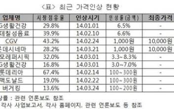 식품업계 등 최근 가격 인상을 단행한 기업들의 암묵적 담합 의혹이 제기됐다. 동종업계 1-2위 업체가 30~40일 간격으로 가격 인상을 단행한 것. 정부의 솜방망이식 처벌이 문제를 키웠다는 지적이 나오고 있다. 15일 한국소비자단체협의회(이하 소단협)는 기업들의 가격 인상 행태를 볼 때 암묵적 담합이 의심된다며 정부의 철저한 조사와 처벌 강화를 촉구했다. 소단협에 따르면, 제과업계에서 45%의 시장 점유율을 차지하는 업계 1위 업체 롯데제과가 지난해 10월 가격 인상을 발표한 후 3개월 이내 주요 제과 4사가 모두 제품 가격을 10% 내외로 인상했다. 음료업계에서 시장 점유율 1-2위를 다투는 롯데칠성음료와 LG생활건강 또한 40일 간격으로 가격 인상을 발표했으며 각사의 대표 브랜드인 펩시콜라와 코카콜라의 경우, 각각 6.6%, 6.5%으로 인상률까지 동일한 수준이었다. 영화관 업계도 사정은 마찬가지. CGV와 롯데시네마는 2D 영화 관람료는 25일 간격으로 1000원씩 인상하며 주말 일반 2D 관람료를 동일하게 1만원으로 책정했으며 인상시기·방식·금액, 최종금액까지 모두 동일하게 맞췄다. 화장품 업계의 1-2위 업체인 아모레퍼시픽과 LG생활건강도 지난달 1일 화장품 가격을 동시에 인상했다. 대표 패스트푸드점인 롯데리아와 맥도날드, 버거킹도 3사 모두 28일 이내 연달아 가격 인상을 단행한 것으로 드러났다. 소단협 관계자는 "지난해에도 밀가루(CJ제일제당, 대한제분, 삼양사, 동아원)와 장류(CJ제일제당, 대상, 샘표식품) 가격이 1~2월에 모두 인상됐으며 8~9월 원유 가격 연동제 시행을 빌미로 모든 유업체가 흰우유 1L의 가격을 200~220원 인상했다"며 "공정거래위원회는 생필품 품목에 대한 담합행위를 더욱 엄정하게 규제해야 하며, 행정규제를 강화하고 형사적 처벌도 적극 고려해야 한다"고 강조했다. 이소은 기자 luckysso@joongang.co.kr 2014.04.16 07:00