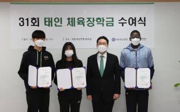 육상 꿈나무 선수들이 태인 체육장학금을 받았다. 대한하키협회 회장인 ㈜태인 이상현 대표는 23일 대한육상연맹 회의실에서 대한육상연맹 김정봉 부회장, 태인체육장학금 육상부문 선정위원인 황영조 감독(국민체육진흥공단, 대한육상연맹 이사)과 함께 장학금 수여 행사를 열었다. 원곡고등학교 비웨사 다니엘 가사마, 경기체육고등학교 김태훈, 가평고등학교 김다은, 경북체육고등학교 신한슬이다. 1990년부터 시작되어 31회를 맞이한 태인체육장학금은 육상 분야를 포함해 핸드볼, 양궁, 산악, 역도, 탁구를 비롯한 다양한 체육 종목 선수들에게 매년 체육장학금을 지원하고 있다. 2020 도쿄올림픽 양궁 금메달리스트인 안산, 김제덕 선수도 장학생 출신이다. 육상은 현재까지 66명에게 장학금이 수여됐다. 역대 선정위원으로는 베를린 올림픽의 영웅 고 손기정, 산악인 고 김창호 대장을 비롯해 올림픽 금메달리스트 황영조, 임오경, 장미란, 유승민, 이은경이 선정위원으로 참여하고 있다. 황영조 감독은 "이번 장학금 수여를 계기로 더욱 열심히 운동해서 좋은 성과를 내는 선수가 되기를 바라며, 또한 후배들에게 나눔을 베풀 수 있는 멋진 육상인이 되기를 기원한다"고 격려했다. 비웨사는 "이번 장학금 선정을 계기로 앞으로 더욱 열심히 훈련하고, 새로운 각오를 다지는 기회로 삼겠다"고 밝혔다. 이상현 대표는 올해 1월 대한하키협회장에 취임하며, 외할아버지(고 구태회 전 대한역도연맹 회장), 아버지(이인정 전 대한산악연맹 회장)에 이어 한국체육계 사상 최초로 3대째 올림픽 종목단체장을 맡았다. 이 회장은 "육상종목은 태인체육장학사업 초기부터 고 손기정 선생과 함께 육성한 종목인 만큼 더 큰 의미가 있다. 비웨사 같이 다양한 문화적 배경의 친구들이 스포츠를 통해 우리 사회 일원으로서 하나가 될 수 있도록 태인체육장학금이 앞장서도록 노력하겠다"고 말했다. 김효경 기자 kaypubb@joongang.co.kr 2021.11.23 20:12
