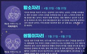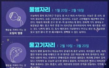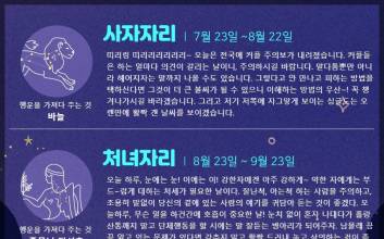 자료제공 : 점신 물병자리 (1.20 ~ 2.18) 오늘따라 몸이 천근만근 무겁다. 몸 쓰고 머리 쓰기보다는 오늘은 좀 쉬자. 휴식이 필요하다. 요즘 고민거리가 있더라도 오늘은 고민해봤자 해결책이 안보인다. 마음의 여유를 갖고 맘 편~히 휴식하는게 좋다. 만화책 가득 쌓아놓고 뒹굴뒹굴 해도 좋고 하루 종일 TV 리모콘을 만지작만지작 하며 게으름을 피우는 것도 나쁘지 않다. 단, 혹시 애인과의 기념일이나 부모님 생신 등 기념일을 잊고 있진 않나 한 번 체크해보자. 깜빡할 수 있는 날이다. 행운을 가져다 주는 것 : 오징어 땅콩 물고기자리 (2.19 ~ 3.20) 머리가 팽팽 돌아가니 학습능력이 끝내주게 좋은 날이다. 어려웠던 과목, 어려웠던 부분이 금세 이해되고 한 번 알려준 것은 머릿속에 쏙쏙 들어온다. 학문적인 내용이 아닌, 인생이나 연애사업과 관련된 내용들도 머리에 곧바로 입력되니 기억력이 늘 오늘만 같으면 얼마나 좋을까. 자격증관련 책자나 어학관련 책을 들춰보는 것도 좋겠고, 남친, 여친과의 잔잔한 추억을 만들어도 기억에 오래 남겠다. 행운을 가져다 주는 것 : 무제 연습장 양자리 (3.21 ~ 4.19) 당신의 방식대로 밀고 가는 것보다는 주변 사람들에 도움을 받는 게 좋은 날이다. 당신 혼자 했을 때보다 더 많은 이득을 얻을 수 있다. 당신 고집대로 밀고 가다간 상대방과 마찰이 생길 수 있으니 주의해야 한다. 오래돼서 잊어버리고 있었던 돈을 친구가 갑자기 갚는다거나 길바닥에 떨어진 돈을 줍는다거나 어디서라도 돈이 생기는 날이다. 그러나 쉽게 들어오니 쉽게 나갈 수있다. 돈에 너무 스트레스받지 말자. 별 득이 없다. 행운을 가져다 주는 것 : 반바지 황소자리 (4.20 ~ 5.20) 격식과 형식을 차리기 보다는 실질적인 것이 먹히는 날이다. 선후배 사이에서도 괜한 인사말은 오히려 사이를 어색하게 만들 수 있다. 노력하여 준비한 일에 결실을 맺는 날이다. 여럿이 함께 작업하는 일을 계획하고 있다면 득과 실을 잘 따져보도록 하자. 분위기에 휩쓸리지 않고 내 입장을 확실하게 표현하는 것이 필요한 날이다. 주위 환경을 정리하면 좋은 날! 집에 있는 김에 버릴 건 좀 버리자. 행운을 가져다 주는 것 : 커피자판기 쌍둥이자리 (5.21 ~ 6.21) 자신을 위한 투자를 하자. 사우나에 가서 긴장감으로 뭉친 근육들을 풀어주거나, 네일숍에 가서 부러진 손톱을 손질하거나.오늘 당신에게 쓰는 돈은 절대 아까워하지 말자. 당신의 활동반경 안에서 뜻밖의 반가울 사람을 만나게 될 테니 미리미리 준비하도록 하자. 일이 꼬여 다지고 들 일이 생기더라도 릴 렉스~ 육체적인 건강뿐만 아니라 정신적으로도 휴식을 취하게 해주자. 만나게 될 그 사람에게 최대한 좋은 모습을 보일 수 있도록. 행운을 가져다 주는 것 : 빗 게자리 (6.22 ~ 7.22) 사랑하는 연인과 사랑을 속삭이는 당신. 오늘은 더 조심하고 조심하자. 당신의 연인이 지금 예민한 상태. 짜증내고 답답해 할 것이다. 이때 당신마저 그렇다면 크게 싸우게 될 지도. 그렇게 되지 않도록 당신이 좀 더 여유를 가지고 연인을 이해하자. 내일이면 당신의 연인이 먼저 사과할 것이다. 짜증내는 연인에게 목재류의 액세서리, 장식등을 선물해보자. 한결 나아질걸?! 오늘 당신과 연인이 가기에 좋은 장소는 사람들이 많은 곳이다.^^ 행운을 가져다 주는 것 : 팔찌 사자자리 (7.23 ~ 8.22) 띠리링 띠리리리리리리~ 오늘은 전국에 커플 주의보가 내려졌습니다. 커플들은 하는 일마다 의견이 갈리는 날이니, 주의하시길 바랍니다. 말다툼뿐만 아니라 헤어지자는 말까지 나올 수도 있습니다. 그렇다고 안 만나고 피하는 방법을 택하신다면 그것이 더 큰 불씨가 될 수 있으니 이해하는 방법의 우산~! 꼭 챙겨나가시길 바라겠습니다. 그리고 저기 저쪽에 자그맣게 보이는 싱글도는 오랜만에 활짝 갠 날씨를 보이겠습니다. 행운을 가져다 주는 것 : 바늘 처녀자리 (8.23 ~ 9.23) 오늘 하루, 눈에는 눈! 이에는 이! 강한자에겐 아주 강하게~ 약한 자에게는 부드~럽게 대하는 처세가 필요한 날이다. 잘난척, 아는척 하는 사람을 주의하고, 조용히 말없이 당신의 곁에 있는 사람의 얘기를 귀담아 듣는 것이 좋겠다. 오늘하루, 무슨 일을 하건간에 호흡이 중요한 날! 눈치 없이 혼자 나대다가 홀랑 산통깨지 말고 단체행동을 할 시에는 말 잘듣는 병아리가 되어주자. 남몰래 끙끙 앓고 있는 문제가 있다면 감추지 말고 활짝 드러내 놓고 상의하는 것이 좋겠고 가만히 앉아서 생각만 하기보다 직접 발로 뛰며 해결하는 것이 결과가 더 좋은 날이겠다. 행운을 가져다 주는 것 : 줄무늬 티셔츠 천칭자리 (9.24 ~ 10.22) 주변의 의견에 귀 쫑긋 세우고 잘 새겨들어야 실수가 없는 날이다. 당신의 강압적인 진행이 다른 사람들의 불만을 사고 있다는 것을 깨달을 것. 주변의 상황을 이모저모 잘 따져보고 주변 사람들을 잘 설득시킬 방법을 생각해보는 것이 좋을 듯. 오늘따라 당신의 패션 스타일에 관심을 갖는 사람들이 많다. 처음부터 끝까지 쭈욱~ 확실하게 패션리더의 모습으로, 적당한 잘난척은 당신의 주가를 높일 수 있겠다. 행운을 가져다 주는 것 : 가죽가방 전갈자리 (10.23 ~ 11.22) 이불 속에서 나오기 싫은 아침을 맞았다. 아침