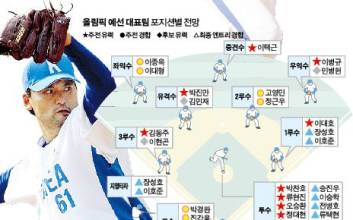 2008 베이징 올림픽 본선 티켓을 노리는 야구 '드림팀'의 윤곽이 드러나고 있다. 지난 11일부터 일본 오키나와에서 전지 훈련 중인 대표팀은 오는 12월 1일 대만에서 열리는 아시아 예선 개막 때까지 상비군과의 일곱 차례 평가전 등을 통해 최종 엔트리 24명을 가려낸다. 아직 전훈 초반이기는 하지만 김경문 감독(두산)과 선동열 수석코치(삼성 감독) 등 코칭스태프의 의견과 선수들의 최근 컨디션 등을 종합해 대표팀의 주전 라인업과 최종 엔트리 경쟁 구도를 정리했다. ▲포지션별 주전  외야수는 이미 최종 엔트리 5명의 얼굴이 확정됐다. 이병규가 우익수, 이택근(현대)이 중견수로 주전 자리를 꿰찼고, 좌익수는 이종욱(두산)과 이대형(LG)이 경합 중이다. 민병헌(두산)은 대주자나 대수비 임무를 맡는다.  내야 역시 1루수 이대호(롯데) 유격수 박진만(삼성) 3루수 김동주(두산)가 확실한 주전 멤버이고, 2루수는 고영민(두산)과 정근우(SK)가 경쟁을 벌인다. 백업 요원으로는 유격수 김민재(한화)와 3루수 이현곤(KIA)이 나선다. 포수 부문에서는 박경완(SK)과 진갑용(삼성)·조인성(LG) 등 베테랑 안방 마님들이 가장 치열한 경합을 펼치고 있다. ▲예상 타순 김 감독은 클린업 트리오인 3∼5번에 각각 이병규·김동주·이대호를 기용하겠다고 발표했다. 공격의 첨병인 1·2번 타자에는 이종욱과 이대형·정근우가 후보로 꼽힌다. 고영민은 2루 주전으로 뛸 경우 2번 타자로 나설 수 있다. 6번 타순에는 장성호(KIA) 또는 이호준(SK)이 지명 타자로 기용될 예정. 7∼9번 하위 타선에는 이택근과 박진만, 주전 포수 등이 포진할 전망이다. ▲마운드 보직 선발 투수로는 박찬호(LA 다저스)와 류현진(한화)·류제국(탬파베이) 등이 유력한 후보로 거론된다. 박찬호는 전천후 불펜 요원으로 활용될 수도 있다. B그룹 1위팀과의 경기에는 이승학(두산) 또는 전병호(삼성)가 선발로 나설 전망. 마무리는 오승환(삼성)과 정대현(SK)이 맡고 우완 한기주(KIA)와 좌완 송진우(한화)·류택현(LG)·권혁(삼성)·장원삼(현대) 등 나머지 투수들은 중간 계투로 기용될 것으로 예상된다. ▲최종 엔트리 경쟁 김 감독은 최종 엔트리 24명을 투수 9, 포수 2, 내야수 8, 외야수 5명으로 꾸릴 계획이다. 15일 합류하는 이병규(주니치)를 포함해 오키나와 전훈에 참가 중인 예비 엔트리는 모두 30명. 그 중 투수 3, 포수 2, 내야수 1명 등 총 6명이 막판 탈락의 고배를 마셔야 한다. 가장 관심을 모으는 것은 내야수 가운데 1루 백업인 장성호와 이호준 중 한 명이 제외될 가능성이 높다는 점. 투수의 경우에는 박찬호·류현진·오승환 등 확실한 주전을 제외하고 선발 경쟁에서 밀린 투수나 중간 계투 요원 중에서 탈락자가 나올 전망이다. 포수는 4명 중 2명이 짐을 싸야 하는 확률 50%의 서바이벌 게임을 벌이고 있다. 오키나와=신화섭 기자 2007.11.14 10:45
