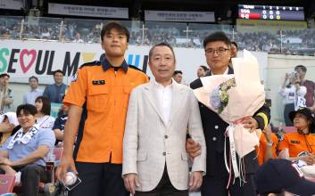 24일 행사에선 경북 119 산불대응단 손용원 소방교가 시구를 맡았다. 손용원 소방교가 시구를 맡게 된 건 지난 3월 소방관들이 영남의 역대 최대규모 산불을 진압한 것을 기리기 위해서다. 손 소방교는 이날 시구 복장으로 영남 산불 진화 작업 당시 입었던 방화복 상의를 착용해 그 의미를 더했다.이날 구장을 찾아 경기를 관람하던 박정원 구단주는 경기 중 소방 가족들을 찾아가 행사의 의미를 더했다. 박 회장은 3회 초 종료 후 직접 관중석을 찾아가 시구자인 손용원 소방교와 부친 손진복 소방경(2003년 대구 지하철 참사 당시 소방 활동 참여)을 찾아가 꽃다발을 전달했다.