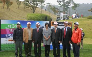 박세리(가운데)가 대회장을 방문에 문경안 회장(왼쪽 세번째) 등 대회 관계자와 기념 촬영을 하고 있다. 국내 골프공 전문 제조업체인 ㈜볼빅(회장 문경안)이 주최하는 제3회 박세리배 전국초등학교골프대회(사진)가 10일 이틀간의 일정으로 경기도 여주의 소피아그린CC에서 개막했다. 박세리배는 2007년 동양인 선수로는 처음으로 세계골프 명예의 전당에 헌액된 박세리(34·KDB산은금융그룹)를 기념하고 새로운 어린 골프꿈나무를 발굴 육성하기 위해 한국초등학교골프연맹과 볼빅이 공동으로 주최하는 대회다.박세리 선수는 대회 첫날 직접 대회장을 방문해 팬 사인회 및 사진 촬영 시간을 갖는 어린 골프선수들을 격려했다. 문경안 회장은 "지난해부터 타이틀 스폰서를 맡고 있는데 제2의, 제3의 '박세리 키즈'를 배출하는 대회로 발전시키겨 나가겠다"고 밝혔다. 이 대회는 전국초등학교 골프선수 207명이 참가한 가운데 항룡부(5~6학년 남자), 불새부(5~6학년 여자), 기린부(1~4학년 남자), 청학부(1~4학년 여자) 등 4개 부문으로 나눠 10~11일 2라운드 36홀 스트로크플레이로 각 부문별 개인 우승자를 가린다. 2011.10.10 21:58