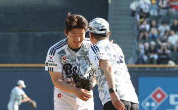 3일 오후 잠실야구장에서 열린 2025 프로야구 KIA와 두산 경기. 두산 선발 곽빈이 시구하기위해 마운드에 오른 한국 야구의 살아있는 전설 '불사조' 박철순에게 인사하고 있다. 잠실=정시종 기자 capa@edaily.co.kr /2025.06.03. 2025.06.03 17:16