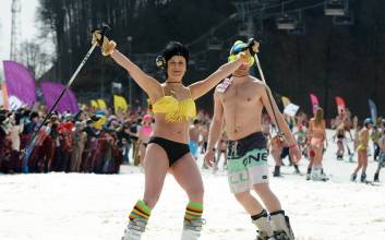 2014년 동계올림픽이 열렸던 러시아 소치에서 31일(현지시간) '부겔우겔 축제'가 열렸다.축제의 하이라이트는 이날 열린 '수영복 입고 스키·스노보드 타기'하얀 눈 만큼이나 시원한 수영복을 입은 참가자들은 소치 국립공원 부겔우겔(BoogelWoogel)의 로자 후토르 스키 슬로프를 거침없이 활강했다. 지난 2014년 소치 동계올림픽을 계기로 2016년 시작된 이 축제에는 매년 수천 명의 스키어와 스노보더들이 수영복을 입고 참가하고 있다.지난해에는 한 번에 1200명이 참가해 기네스북에 오르기도 했다. 지난달 29일 목요일부터 1일(현지시간)까지 나흘 동안 열리는 올해 축제에도 연인원 2만여명이 참가할 것으로 보인다.축제에서는 수영장으로 스키점프, 홀리 색채축제 등이 함께 열린다. 2018.04.01 18:16