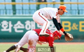 5일 대전구장에서 열린 한화-KIA전 1회초 1사 만루에서 1루주자 장성호가 최희섭의 내야땅볼 때 2루에서 포스아웃되고 있다. 병살처리하는 한화 유격수는 김민재.대전=김진경 기자 2008.04.05 17:17