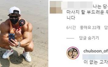 스포츠트레이너이자 '징맨'으로 유명한 황철순이 성희롱 성의 댓글에 쿨하게 맞대응해, "완전 사이다!"라는 반응을 끌어모았다.20일 황철순은 인스타그램에 부산 광안리해수욕장에서 찍은 사진을 올려놨다. 이 사진에서 그는 근육질 몸매를 드러낸 채, 해수욕장에서 여유를 즐기는 모습이었다.하지만 이 사진을 접한 한 네티즌은 "나는 당신의 00을 마사지할 부드러운 두 손이 있습니다"라고 성희롱적인 댓글을 올려놓았다. 이에 황철순은 "저는 00이 없는 고자입니다"라는 댓글을 달아 쿨하게 대응했다.황철순의 반응에 많은 이들은 "쿨내 진동이네요", 완전 사이다!", "기분 나쁘실 수 있을텐데 성격이 매우 유쾌하신 것 같다" 등의 반응을 보였다.한편 황철순은 지난 2011년부터 2016년까지 tvN '코미디빅리그'에서 '징맨'으로 활약해 화제를 모았다.최주원 기자