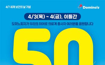 도미노피자가 의료계 종사자들을 응원하는 ‘히어로즈 데이’를 진행한다.도미노피자의 이번 ‘히어로즈 데이’(HERO’S DAY)는 세계 보건의 날인 오는 7일을 앞두고 국민 보건의식을 향상시키고 보건의료 및 복지 분야의 종사자를 격려하기 위해 진행되는 프로모션이다. 오는 4월 3일부터 4일까지 모든 의료계 종사자들에게 방문 포장 주문 시 50% 할인 혜택을 제공한다.이번 세계 보건의 날 ‘히어로즈 데이’ 혜택은 매장에서 의료기관 명함, 사원증, 의료자격 신분증 등을 통해 매장에서 신분 확인 후 이용 가능하며, 1회 2판까지 적용이 가능하다. 한편 도미노피자는 지난해에도 경찰과 국군 장병, 교사, 소방 등 국민의 안전하고 평화로운 일상을 위해 노력하는 모든 분들을 위한 행사를 진행해왔다. 또 파티카를 통한 피자 후원과 환아 치료비 지원 등 꾸준한 선행으로 배달 피자 업계 1위에 걸맞은 사회공헌 활동을 펼쳐오고 있다. 도미노피자 관계자는 “세계 보건의 날을 맞아 국민의 생명과 안전을 위해 헌신하는 모든 의료계 영웅분들에게 응원과 감사의 마음을 전하기 위해 ‘히어로즈 데이’를 진행한다”며 “도미노피자는 앞으로도 국가와 국민을 위해 항상 최선을 다하는 우리 사회의 영웅들을 응원하는 활동들을 지속해 나가겠다”고 말했다.이현아 기자 lalalast@edaily.co.kr