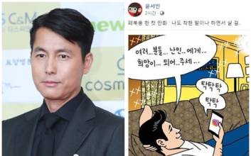 비난도 관심이라 좋아하며 박수를 짝짝 치고 있지 않을까. 딱히 비난할 마음조차 생기지 않는 혼자만의 저격이다.만화가 윤서인이 또 가만히 있는 정우성의 멱살을 잡았다. 이쯤되면 비뚤어진 정우성의 광팬 수준이다.윤서인은 21일 자신의 SNS에 ''아니 왜 남보고 희망이 되어달래 자기는 희망이 안 되어주면서. 최소 몇 명이라도 좀 데리고 살면서 이딴 소리를 하세요. 우성 씨. 이러면 난 또 개념배우에게 시비 턴 무개념 만화가가 되겠지. 에휴'라고 저격했다.또 '한 컷 만화 : 나도 착한 말이나 하면서 살걸'이라는 글과 함께 그림 한 장도 공개했는데, 해당 그림에는 소파에 드러누워 휴대폰으로 SNS를 하는 듯 '여러분들 난민에게 희망이 되어 주세…'라는 글을 남기고 있는 한 남성의 모습이 담겨 있다. 집안을 반짝반짝 빛나게 표현해 놓은 지점이나, 잘생기고 깔끔하게 그려넣은 얼굴은 정우성을 연상시키기 충분하다.앞서 정우성은 SNS에 '오늘은 세계 난민의 날입니다. 전 세계에서 6850만명의 사람들이 집을 잃었다고 합니다. 이 중 1620만 명은 2017년 한 해 동안 집을 잃었습니다. 오늘 난민과 함께 해주세요. 이들에 대한 이해와 연대로 이들에게 희망이 되어주세요'라는 글을 남겼다.정우성은 전세계 11명의 UN난민기구(UNHCR) 친선대사 중 한 명이다. 지난 2015년 5월 세계적으로 10번째, 아시아에서는 두 번째 친선대사로 임명됐다. 2014년 명예대사 자격으로 네팔에 방문한 후 여러차례 난민촌을 직접 방문했던 정우성은 친선대사로 공식 임명되면서 난민에 대한 관심은 물론, 친선대사로서 남다른 책임감을 지속적으로 드러냈다. 심지어 개봉하는 영화 홍보 기간 중에도 집중적으로 쏟아지는 관심을 오히려 역이용해 난민에 대한 이야기를 전했던 그다.때문에 네티즌들은 윤서인의 정우성 저격에 콧방귀를 끼면서 그가 그린 만화 역시 '외모도, 사상도, 영향력도, 정우성이 되고 싶지만 되지 못하는 자신의 모습을 콜라보레이션 해 그려넣은 것 아니냐'는 반응을 나타내고 있다. '정우성이라면 소파 밖으로 다리가 떨어질 것'이라는 우스갯소리는 덤으로 얻고 있다.윤서인은 극우 성향으로 알려진 인물. 진심인지, 관심을 얻기 위해 일부러 선택한 자극적인 언행들인지 알고 싶지도 않지만 차곡차곡 쌓은 비호감 마일리지는 대중들을 등 돌리게 만들었다. 그간 조두순 사건과 세월호 사건, 소녀상을 희화화 하는가 하면, 걸그룹 소녀시대를 성적으로 조롱하는 등 하나만 해도 평생 비난 받았을 발언을 여러 번 거듭한 바 있다.정우성에 대한 저격도 처음은 아니다. 지난해 12월 정우성이 언론노동조합 KBS본부(새노조)에 보낸 파업 응원 영상에서 "KBS가 공영방송으로서 참 많은 실수를 했다. 그로 인해 시청자들은 상처받고 외면당했다"고 말한 것을 두고 윤서인은 '지금 연예인으로서 참 많은 실수를 하고 계신 듯. 실수란 자기가 뭔가 잘못을 했을 때 스스로 '실수했다'고 하는 것. 남한테 '너 실수한 거야'라고 말하는 건 협박이나 다름 없는 것 아닌가'라는 글을 남겼다.윤서인은 '안녕하세요. 짱 잘생긴 유명 연예인씨. 덕분에 하루종일 검색어 1등이라 몹시 피곤한 윤서인입니다. 그래도 기왕 이렇게 된 거 본질적인 얘기를 한번 나눠 보아요. 현재 KBS에서 열심히 방송 만드는 사람들이 어째서 실수하는 건가요? 남에게 실수한다는 지적을 하려면 어떤 점이 실수인지를 말을 하셔야지 무조건 실수라고만 하면 안되잖아요. 저는 도대체 어떤 점이 실수인지 아직도 넘 궁금해요'라고 물었다.또 '아무튼 뭐 생긴 건 완패 인정합니다. 남자는 역시 잘생긴 외모보다는 좀 뚱뚱하고 못생기더라도 생각이 바로 잡히고 똘똘한 남자가 최고인 것 같다. 여성 여러분 남자 잘생긴 거 하나도 소용 없답니다. 얼굴 뜯어먹고 살 것도 아니자너'라고 비아냥거리며 외모에 대한 자책과 정신승리 발언을 괜스레 덧붙이기도 했다.사실 정우성의 난민 관련 메시지는 최근 '제주도 예멘 난민 사태'와 맞물리면서 네티즌들의 갑론을박을 불러 일으켰다. 자신의 사회적 영향력을 명확히 알고 늘 긍정적인 방향으로 목소리를 높인 정우성이지만 이번 발언에 있어서 만큼은 대중의 반응이 엇갈렸다.하지만 윤서인이 등판하면서 정우성은 다시 옹호받게 됐다. 호감도의 정점에 있는 정우성과 비호감 낙인이 찍힌 윤서인을 붙여 놓으면 자연스레 정우성을 감싸게 되는 것은 당연지사. 윤서인은 정우성을 저격했지만 되려 욕받이를 자청하며 정우성을 도와준 셈이 됐다. 인복 아닌 인복(?)까지 정우성 사전에 '무너짐'이란 없다.조연경 기자 cho.yeongyeong@jtbc.co.kr 2018.06.21 16:25
