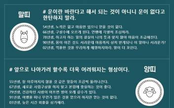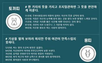 자료제공 : 점신 쥐띠 # 운이란 바란다고 해서 되는 것이 아니니 운이 없다고 한탄하지 말라. 48년생, 급하다고 하여 조급하게 서두르거나 당황하면 손해를 본다. 60년생, 구설수에 오르게 된다. 언행에 각별히 조심하라. 72년생, 하고자 하는 일의 결실이 나의 뜻과 맞지 않아 마음이 조급해진다. 84년생, 몸도 아프고 마음의 상처까지 받게된다. 96년생, 눈 앞의 쾌락에 주의해라. 소띠 # 앞으로 나아가려 할수록 더욱 어려워지는 형상이다. 49년생, 잘 이루어지지 않을 것 같은 일들이 조금씩 원만하게 풀려 나간다. 61년생, 오늘은 새로운 일을 만들기보다는 현재를 안정시켜라. 73년생, 건강하던 사람이 아프면 병이 오래 갈 수가 있다. 85년생, 여행을 떠나 무언가 많은 것을 얻으려 하지만 얻는 것이 없다. 97년생, 자신이 하려는 것을 다시한 번 점검하라. 범띠 # 모든 일이 꼬이고 막혀 갑갑하고 괴로운 심경이다. 50년생, 욕심을 버리고 심신(心身)수양에 힘쓰도록 하라. 62년생, 사악한 마음은 절대 금물이다. 74년생, 작은 소원도 지성으로 기도하면 이루어지리라. 86년생, 취업하려면 시기가 좋지 않다 좀 더 기다려라. 98년생, 조금 잘 된다고 안주하지마라. 토끼띠 # 한 가지의 뜻을 가지고 초지일관하면 그 뜻을 완전하게 이룬다. 51년생, 주변사람들과의 마찰이 있어도 자신의 뜻을 굽히지 말라. 63년생, 직업은 자신의 능력에 맞지 않는 곳을 찾다 보면 멀게만 느껴 질 것이다. 75년생, 가까운 거리를 짧은 시간에 여행 다녀오는 것이 좋다. 87년생, 귀인이 서로 도와주니 그 가운데 이익이 있다. 99년생, 너무 일찍 포기하지마라. 결과는 아무도 모른다. 용띠 # 기상을 펼쳐 보이려 하지만 주위여건이 만족스럽지 못하다. 52년생, 귀하가 하는 일의 조금씩 발전은 있겠다. 64년생, 자금회전이 어려워 전전긍긍하며 날을 보낸다. 76년생, 실력을 인정받기가 어려워 취업이 걱정된다. 88년생, 취직 하고자 하면 남쪽으로 원서를 내라 합격하리라. 00년생, 집 밖의 기운이 흉하니 일찍 귀가해라. 뱀띠 # 너무 커다란 욕심을 부린다면 오히려 화를 부를 수 있다. 53년생, 육체적인 건강보다 정신적인 건강을 더욱 생각해야 할 때이다. 65년생, 복잡한 문제로 마음이 불편할 텐데 마음을 편히 갖고 안정을 취함이 좋다. 77년생, 무리하게 사업을 확장하려 하지 말고 현재의 상태를 유지해라. 89년생, 이미 약속되어 있는 여행이라면 몰라도 일부러 여행을 떠나지 말라. 01년생, 다른 사람의 잘못을 탓하지마라. 말띠 # 어려운 상황이겠으니 혼자의 힘으론 할 수가 없다. 54년생, 주변의 좋은 친구를 만나 고민을 얘기하는 것이 좋으리라. 66년생, 남쪽에 귀인이 있으니 도움을 받는다면 희망이 생길 것이다. 78년생, 헛된 욕심을 버려라. 공연한 일로 눈코 뜰 새 없이 바쁘겠다. 90년생, 창업을 준비한다면 아직은 기초 준비과정이니 무리하게 시작하지 마라. 02년생, 대체적으로 안정적인 하루이다. 양띠 # 용이 머리에 뿔이 돋아나니 머지않아 승천하게 되리라. 55년생, 땅을 파서 금을 캐내니 마침내 형통하리라. 67년생, 일에 있어서 처음에는 비록 힘이 들지라도 나중에 집에 기쁨이 가득하리라. 79년생, 어떠한 이유로든 여행을 떠나라. 91년생, 원서나 문서는 남쪽에 내라. 합격하리라. 03년생, 몸과 마음을 깨끗하게 해라. 원숭이띠 # 머뭇거릴 시간이 없다. 좋다면 무조건 밀고 나가라. 56년생, 옛 친구들과 우연히 만나 즐거운 시간을 보낸다. 68년생, 대수롭지 않게 생각한 병이 관리를 잘못하여 합병증을 유발하기도 한다. 80년생, 사업은 과감한 결단성과 놀라운 추진력이 있어야만 대성할 수 있다. 92년생, 느긋한 행동 또한 퇴보를 불러일으키는 요인임을 알아야 한다. 04년생, 몸에 좋은 것이 맛은 쓰다. 닭띠 # 화술이 뛰어나니 사람들이 주변에 많다. 57년생, 갑갑하고 길이 보이지 않는 듯하여 조바심이 날 수 있다. 69년생, 누구나 어려움은 한 번쯤 겪게 되나 어떻게 벗어나는 가가 중요하다. 81년생, 구설수를 많이 듣게되니 주의하라. 93년생, 주위에서 시끄러운 말썽 등 많은 구설수에 시달리게 되니 오래 시간을 끌수록 불리하다. 05년생, 너무 강하고 좋은 것에는 문제가 있으니 주의해라. 개띠 # 주위의 유혹이나 어려운 상황에 놓이게 된다. 58년생, 크게 운이 좋아지거나 나빠지지 않고 조금씩 나아진다. 70년생, 어떤 운이든 흐름이 있으니 좋은 흐름의 시기를 알고 나아가면 막힘이 없으리라. 82년생, 욕심을 버리고 지금의 상황에 만족하는 지혜가 필요한 때이다. 94년생, 주위에 어떤 유혹이 있어도 굳게 마음먹고 조심하라. 06년생, 하나라도 제대로 하려는 생각을 가져라. 돼지띠 # 푸른 소나무와 대나무는 그 절개를 잃지 않는다. 59년생, 한 가지 뜻을 세워놓고 그 마음이 변하지 않으니 반드시 뜻을 이룬다. 71년생, 도와주는 사람이 있으니 소망하는 일을 이룰 수 있다. 83년생, 재물 운이 좋으니 사소한 계획도 성공한다. 95년생, 주변 사람들이 모두 나를 이롭게 한다. 07년생, 뜻밖의 횡재수를 만나게되니 기쁨이 생긴다.