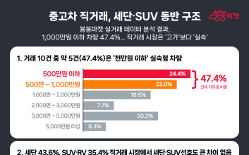 고금리와 경기 침체 여파로 중고차 시장에 '거품빼기' 바람이 불면서 1000만원대 실속형 차량을 구매하려는 알뜰 소비족이 늘어나고 있다.중고차 직거래 플랫폼 붕붕마켓은 2024년 7월부터 2025년 12월까지 자사 플랫폼 내 거래 데이터를 분석한 결과, 전체 거래 완료 차량의 47.4%가 '1000만원 이하' 가격대인 것으로 나타났다고 12일 밝혔다.세부적으로 살펴보면 ▲500만원 이하 초저가 차량이 24.4% ▲500만~1000만원 구간이 23.0%를 차지했다. 이는 소비자들이 신차급 고가 중고차보다는, 운전 연수용이나 세컨드카 목적으로 부담 없이 탈 수 있는 가성비 매물을 직거래 시장에서 적극적으로 찾고 있음을 시사한다.특히, 주목할 점은 일반 중고차 매매상사(딜러 시장)에서는 회전율이 좋은 '세단' 비중(약 60%대)이 압도적인 반면, 붕붕마켓 직거래에서는 세단(43.6%)과 SUV(35.4%) 거래 차이가 크지 않았다. 그 다음으로 소형/경차(12.9%), 기타(8.1%) 순이며, 직거래가 많이 된 SUV 모델은 싼타페, 쏘렌토, 카니발 순으로 나타났다.이에 대해 붕붕마켓 관계자는 "딜러에게 매각할 경우 감가 폭이 큰 SUV 차주들이 제값을 받기 위해 직거래로 눈을 돌렸고, 구매자들은 캠핑이나 차박 용도의 저렴한 SUV를 찾기 위해 플랫폼으로 유입되면서 수요와 공급이 맞아떨어진 결과"라며 “중고차 직거래를 하는 소비자는 차종보다 거래가격이 더 중요한 거래요인으로 보인다.”고 분석했다.실제로 붕붕마켓은 100% 실소유주 인증시스템을 도입해 중고차 시장의 고질적인 문제인 허위매물을 원천 차단했다. 딜러 수수료가 없는 투명한 가격 구조와 신뢰할 수 있는 매물 정보가 입소문을 타면서, 합리적인 소비를 지향하는 3040세대 운전자들의 필수 앱으로 자리 잡고 있다.유효선 붕붕마켓 대표는 "불황형 소비 트렌드가 확산되면서, 중간 유통 마진을 없앤 직거래 플랫폼의 역할이 어느 때보다 중요해졌다"며 "단순히 저렴한 차를 넘어, 붕붕마켓만의 검증 시스템을 통해 소비자가 안심하고 탈 수 있는 좋은 차를 연결하는 데 집중하겠다"고 밝혔다.권지예 기자 kwonjiye@edaily.co.kr 2026.02.12 16:39