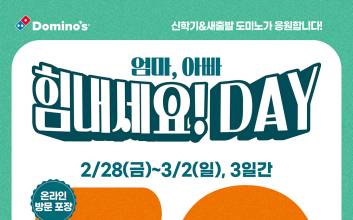 도미노피자가 신학기 및 새출발 시즌인 3월을 앞두고 모든 학생들과 학부모들을 응원하는 ‘힘내세요! DAY’ 이벤트를 진행한다.이번 도미노피자의 ‘힘내세요! DAY’는 3월부터 시작되는 새학기 준비로 바쁜 전국의 학생과 학부모들을 위한 이벤트다. 28일부터 3월 2일까지 모든 피자(M, L) 50% 할인 쿠폰을 제공한다.‘힘내세요 DAY’ 쿠폰은 도미노피자 온라인 모든 회원에게 일괄적으로 발급되며, 온라인 포장 주문 시 사용할 수 있다. 도미노피자의 ‘힘내세요 DAY’ 쿠폰은 주문 1회에 2판까지 적용이 가능하며 신규 회원도 발급 가능하다.한편 도미노피자는 지난해 군인, 선생님, 경찰 등 사회를 위해 헌신하는 분들을 응원하기 위한 ‘히어로즈데이’를 진행하기도 했다.도미노피자 관계자는 “신학기 시즌을 맞아 도미노피자 회원분들의 새출발을 응원하는 마음으로 이번 프로모션을 준비했다”며 “가족, 친구 등 소중한 사람들과 함께 도미노피자를 먹으며 즐거운 시간 보내시길 바란다”고 전했다.이현아 기자 lalalast@edaily.co.kr 2025.02.26 11:09