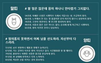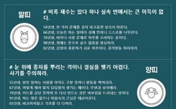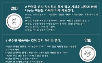 자료제공 : 점신 쥐띠 # 모든 일을 쉽게 이루니 이익이 그 가운데 있다. 48년생, 허황된 일은 삼가 하여라. 후회하게 되리라. 60년생, 일을 급히 도모하여 마음을 태우지 마라 늦게 성취되리라. 72년생, 헛된 재물을 탐내지 마라. 도리어 재물을 잃을 수도 있다. 84년생, 오래된 지병만 아니라면 조금씩 차도가 있다. 96년생, 노력의 결실이 돌아오니 활력이 넘친다. 소띠 # 힘든 일이 생겨도 의지할 곳이 없으니 외롭고 서럽다. 49년생, 혼자서 어려움을 극복하고 이겨 나가야 하는데 너무 지쳐있다. 61년생, 지금의 매매는 이루어지기 어렵다. 때를 기다려라. 73년생, 서쪽이나 북쪽 방향으로 찾아보면 찾는 것을 찾으리라. 85년생, 미룰 수 있는 여행이라면 미루는 것이 좋다. 97년생, 불필요한 경쟁을 하지마라. 범띠 # 달이 먹구름 속으로 들어가니 그 빛을 볼 수가 없다. 50년생, 집안에 불길한 소식이 전달되니 마음이 아프다. 62년생, 친구에게 도움을 청하면 고민하는 일이 해결될 수 있으리라. 74년생, 의외의 돈이 들어와 살림이 불어나겠다. 동업은 길하리라. 86년생, 지나친 간섭은 명예를 떨어뜨릴 수 있으니 주의하라. 98년생, 쉽게 흥분하니 행동에 주의해라. 토끼띠 # 소망이 이루어지리라. 51년생, 주위의 친구나 동료의 유혹에 동조한다면 될 일도 안 되니 주의하여야 한다. 63년생, 겉으로 드러나는 재수는 평범하나 속으로는 짭짤한 수입 등으로 재수가 좋으리라. 75년생, 하고자 하는 사업이 있다면 다음으로 미루는 것이 좋다. 87년생, 누구나 때가 있는 법이다. 아직은 때가 아니다. 99년생, 아랫사람과 금전거래를 하지마라. 용띠 # 반드시 소원이 성취되니 여태껏 치성을 드린 보람이 있겠다. 52년생, 만사가 평온할 때 한 번쯤 멀리 여행을 떠나는 것도 이로울 것이다. 64년생, 많은 이득이 따르는 계약 건이 체결된다. 76년생, 만족할 만한 직장에 특채로 입사하게 되리라. 88년생, 하는 일이 많아지나 마음은 편안하다. 00년생, 공과 사를 분명하게 구분지어라. 뱀띠 # 늦었다고 생각될 때가 빠른 법이다. 지금도 늦지 않았다. 53년생, 윗사람이나 주위 사람의 충고를 절대 가벼이 여기지 말라. 65년생, 몸에 좋은 약은 입에 쓰다고 했다. 77년생, 고집만 내세우다가 결국에는 커다란 위기에 처하게 된다. 89년생, 귀하의 부주의로 귀중한 물건을 잃어버리게 된다. 01년생, 작은 이익이나 일에 대한 소중함을 알아야한다. 말띠 # 만복을 혼자 차지하려 하지 말고 가까운 사람과 함께 나누는 마음을 가져야 더욱 복되겠다. 54년생, 가문이 빛이 나고 자손들이 기쁨을 가져오고 하늘에서도 복을 내리는 형상이다. 66년생, 욕심을 버리면 크게 노력하지 않아도 사업이 번창일로에 있다. 78년생, 남성은 훌륭한 아내를 맞이하게 되며 여성은 출가를 한다. 90년생, 밖으로 나가면 좋지 않다. 02년생, 과도한 친절에 주의해라. 양띠 # 분수껏 행동하는 것이 유익 하리라 본다. 55년생, 처해진 환경이 다소 불우하더라도 그 보다 못한 처지에 있는 사람들을 생각해 볼 때다. 67년생, 혼자로는 힘에 부치는 때이니 권력 있는 사람을 찾아 나서라. 79년생, 모든 것은 항상 시와 때가 있는 법이다. 91년생, 친구의 유혹 등을 조심하라. 03년생, 먼 곳에서 즐거운 소식이 전해온다. 원숭이띠 # 매사를 무사 튼튼하게 노력하고 마음을 바르게 써야 된다. 56년생, 매화는 혹독한 추위가 있어 그 빛을 더 하는 이치를 알아야 한다. 68년생, 자신의 재능을 발휘할 수 있는 기회가 있더라도 항상 배운다는 자세로 임하라. 80년생, 새로운 사업을 시작하는 것은 유리하나 전업이나 취직 등은 힘들겠다. 92년생, 다른 일을 기획해도 성공할 수 없다. 다음 기회로 미루자. 04년생, 중요한 선택을 하게되니 집중력이 필요하다. 닭띠 # 인내심과 끈기가 많이 필요하다. 57년생, 기다리는 마음을 가졌으니 분명히 이루게 된다. 69년생, 크고 작은 어려움이 많이 생기지만 꾸준한 노력으로 이겨낸다. 81년생, 장거리 여행에도 장애가 없을 것이며 어느 곳으로 가도 좋다. 93년생, 지금까지의 방황했던 마음을 바로 잡는구나. 05년생, 부질없는 욕심만 커질 수 있으니 냉정하게 판단해라. 개띠 # 빨리 마음을 바로 잡고 착하게 살아야 한다. 58년생, 방탕한 생활 속에 여러 사람에게 피해를 주니 이 죄를 어찌 면할 수가 있을까. 70년생, 귀하는 죄를 짓고는 마음 편히 살수가 없는 것이다. 82년생, 자신의 부주의로 인해 사업이 어려운 길에 놓이게 되고 심하면 부도를 낼 수도 있다. 94년생, 오늘은 여러 사람을 만나도 쉽게 인연이 맺기 힘들다. 06년생, 예전의 실수로 어려움이 생긴다. 돼지띠 # 일마다 곤고함이 따르니 하루도 편할 날이 없다. 59년생, 쉴 틈 없이 바쁘지만, 실속은 없다. 많은 사람들이 귀하를 도와준다. 71년생, 다소 어려움은 있으나 그럴 때일수록 희망은 가까워진다. 83년생, 역경을 피하지 말고 당당히 맞서라. 95년생, 꾀하는 일이 호황을 맞게 된다. 07년생, 불필요한 질문은 삼가해라.