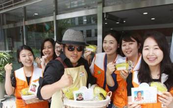 '의리'의 아이콘 배우 김보성이 24일 오후 서울 여의도 월드비전 건물앞에서 직장인을 상대로 사랑의 빵 저금통을 나눠주며 함께 사진도 찍고 있다. 국제구호개발 월드비전의 홍보대사를 맡고 있는 김보성은 이날 '여의도 24번가의 기적'행사에서 한국전쟁 이후 국제사회에서 받은 도움을 희망과 사랑으로 돌려주는 후원 모금활동을 통해 '나눔의리'에 동참했다.김민규 기자 mgkim@joongang.co.kr 2014.06.24 14:13