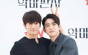 배우 지성, 진영이 1일 오후 온라인 생중계로 진행된 tvN 드라마 ‘악마판사' 제작발표회에 참석해 포토타임을 갖고 있다.'악마판사'는 가상의 디스토피아 대한민국을 배경으로 전 국민이 참여하는 라이브 법정 쇼를 통해 정의에 대한 메시지를 전하는 드라마다. 오는 7월 3일 첫방송된다. 2021.07.01 14:21