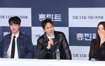 배우 조인성이 4일 오후 서울 용산구 CGV용산아이파크몰에서 열린 영화 '휴민트' 언론배급시사회 및 기자간담회에 참석해 취재진과의 질의응답 시간을 갖고 있다.