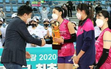 30일 오후 인천 계양체육관에서 열린 2020~2021 프로배구 V리그 여자부 흥국생명과 GS칼텍스의 챔피언결정전 3차전 경기에서 GS칼텍스가 세트스코어 3대 2로 승리, 3연승으로 통합우승을 차지했다.준우승을 거둔 흥국생명 김연경, 김세영, 김미연이 조원태 KOVO 총재로부터 트로피와 상패를 받고 있다.인천=김민규 기자 kim.mingyu@joongang.co.kr /2021.03.30/ 2021.03.30 22:12