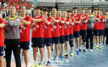 2016 국가대표 핸드볼 한일정기전이 25일 오후 서울 올림픽공원 SK핸드볼경기장에서 열렸다.2016 브라질 리우올림픽에 출전하는 여자대표팀이 경기전 국민의례를 하고있다. 올림픽공원=정시종기자 jung.sichong@joins.com / 2016.06.25./ 2016.06.25 16:06