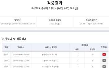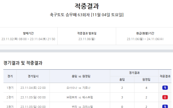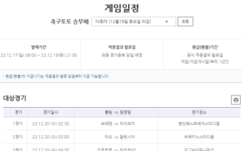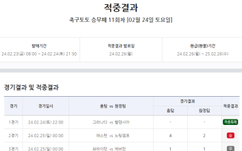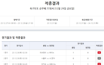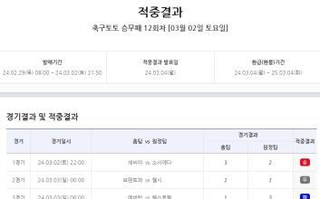 축구토토 승무패 73회차 적중에 성공한 축구 팬들은 오는 12월 18일(월)부터 2024년 12월 18일(수)까지 1년 이내에 전국 토토판매점이나 우리은행 지점에서 적중금을 찾아갈 수 있으며, 이어지는 축구토토 승무패 74회차 게임은 지난 12월 17일(일) 오전 8시부터 발매를 개시해 오는 19일(화) 밤 9시 50분에 발매를 마감한다.축구토토 승무패는 14경기의 축구 경기 결과(▲승▲무▲패)를 맞히는 게임이다. 대상경기중 지난 17일(일) 열렸던 본머스-루턴타운(2경기)전은 루턴타운의 수비수 톰 로키어가 경기 중 심정지로 쓰러지면서, 경기가 취소됐다. 이에 따라 2경기전은 유일하게 적중특례(대상경기 무효)로 처리됐다. 이와 관련해 스포츠토토코리아 관계자는 “축구토토 승무패 73회차는 이변의 결과도 존재했지만, 적중특례 경기로 인해 다수 적중자가 발생했다”며, “현재 발매 중인 축구토토 승무패 74회차 게임에도 많은 관심과 참여를 부탁드린다”고 전했다. 한편, 축구토토 승무패 각 회차 대상경기의 자세한 경기 분석 내용 등은 공식 온라인 발매사이트 베트맨 내 토토가이드 페이지에서 확인할 수 있다.