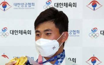 '소년 신궁' 김제덕(17·경북일고)의 파이팅은 양궁장을 떠나 귀국 현장에서도 마찬가지였다. 김제덕은 1일 인천국제공항을 통해 양궁 대표팀 선배들과 함께 귀국했다. 혼성전과 남자 단체전에서 2관왕을 차지하고 금의환향했다. 이날 공항에는 양궁 대표팀의 귀국 모습을 지켜보기 위해 많은 팬들이 마중을 나왔다. 한국 양궁은 도쿄올림픽 양궁에 걸린 5개의 금메달 중 4개를 쓸어 담았다. 남녀 대표팀 6명이 함께 서 기념 촬영이 진행 중이었다. 이때 양궁협회 관계자가 선수들에게 "파이팅을 외쳐 달라"고 주문했다. 이때 우렁찬 목소리로 파이팅을 외친 주인공이 있었으니 다름 아닌 김제덕이었다. 금메달을 땄던 그 순간처럼, 김제덕의 파이팅 외침은 공항 안에 쩌렁쩌렁하게 울려 퍼졌다. 김제덕은 협회 요청에 따라 왼쪽, 가운데, 오른쪽으로 고개를 돌려가며 계속 "파이팅"을 외쳤다. 그 옆에 있던 여자 단체전 금메달리스트 강채영은 김제덕의 파이팅에 순간 깜짝 놀란 듯 보였다. 잠시 후엔 귀를 막는 제스처를 취하기도 했다. 하지만 미소를 지으며, 후배의 패기가 싫지만은 않은 눈치였다. 공항에 모인 수백 명의 팬들은 김제덕의 파이팅을 직접 목격하고선 웃으며, 박수로 화답했다. 김제덕은 도쿄 올림픽에서 계속 "파이팅" "코리아 파이팅"을 외쳤다. 동료들을 응원하고, 자신에게 주문을 거는 것과 마찬가지다. 올림픽을 앞두고 크게 긴장한 탓에 "파이팅"을 외치기 시작했는데 효과가 컸다. 목이 아프고 리듬도 깨질 수 있지만, 부담감을 극복하기 위해 선택한 방법이다. 덕분에 대표팀 막내 김제덕은 생애 첫 올림픽에서 주눅 들지 않고 당당하게 활시위를 당겼고, 두 개의 금메달을 목에 걸었다. 이번 올림픽부터 도입된 혼성전에서 김제덕과 짝을 이뤄 금메달을 딴 안산은 "(김)제덕이가 '코리아 파이팅'을 외치니까, 나도 덩달아서 긴장이 풀렸다. 그래서 조금 더 편안한 마음으로 할 수 있었다"고 고마움을 드러냈다. 인천공항=이형석 기자 lee.hyeongseok@joongang.co.kr