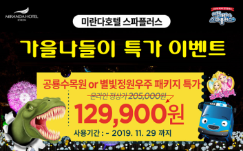 라미드 그룹(회장 문병욱) 호텔 계열사 이천 미란다호텔(대표 문유선)이 '가을나들이 특가' 판매 이벤트를 진행 중이다. 이번 이벤트에서는 공룡수목원과 별빛정원우주를 즐길 수 있는 패키지를 특가에 판매한다. 현재 미란다호텔에서 판매 중인 공룡수목원과 별빛정원우주 패키지를 구매하면 미란다호텔 객실과 스파플러스, 그리고 공룡수목원 또는 별빛정원우주 3인 이용권을 증정한다. 스탠다드 객실, 뉴캐릭터 객실, 타요 객실로 나뉘며 객실 종류에 따라 가격이 나뉜다.이번에 기획한 ‘가을나들이 특가’는 온라인 정상가 205,000원에 판매되는 공룡수목원과 별빛정원우주 패키지를 129,000원의 파격적인 가격으로 제공한다. 타요, 또는 뉴캐릭터룸 (주중) 1박에 스파플러스 워터존(실내온천/실내,외 수영장/노천탕), 공룡수목원 또는 별빛정원우주 입장권 3장으로 구성되어 있다. 예약기간은 10월 29일부터 11월 8일까지이며 예약기간 내 선착순으로 진행하기 때문에 조기마감 될 수 있어 빠른 예약이 필수다. 사용기간은 11월 1일부터 29일까지로 한달간 사용가능하다.이천 미란다호텔은 천연 온천수 워터파크 시설을 갖춘 곳으로 서울 근교 가족 여행지로 적지 않은 관심을 받고 있다. 특히 1870년경 이조 세종대왕 때부터 눈병, 피부병 등에 효능을 인정받은 온천수를 사용한다. 워터파크, 실내수영장, 스파, 노천온천 등의 시설이 있는 '스파플러스'와 호텔 객실 용수로 천연 온천수를 사용하고 있어 남녀노소 찾는 곳인데다 만화영화 캐릭터 '타요', '터닝메카드', '헬로카봇', '소피루비' 등 다양한 캐릭터를 활용한 캐릭터 객실은 항상 만실일 정도로 어린이를 동반한 가족들에게 인기가 높다.미란다호텔 가을나들이 이벤트 관련 자세한 사항은 미란다호텔 SNS에서 확인할 수 있다. 이소영 기자