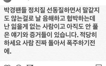박경이 학폭 논란을 인정한 가운데, 피해자가 또 다른 글을 올려 파문이 예상된다. 9월 30일 박경의 학교 폭력에 대해 폭로했던 피해자 A씨는 "박경팬들 정치질 선동질 하면서 말같지도 않는 걸로 날 음해하고 협박하는데 난 잃을 게 없는 사람"이라는 경고성 글을 올렸다.A씨는 "아직도 공개 안 한 얘기와 증거들이 있다. 적당히 하세요. 사람 진짜 돌아서 폭주하기 전에"라고 추가 폭로를 예고하는 듯했다.앞서 A씨는 지난 28일 자신의 인스타그램에 피해 사실을 주장한 장문의 글을 올렸다. 그는 박경과 서울 숭문중학교를 함께 다녔다고 밝혔다. 당시 글에서 그는 "전 블락비의 박경 학폭 피해자입니다. 제 글에는 어떤 거짓도 없는 실제 사실임을 말씀드립니다. 전 박경과 숭문중학교를 다닌 박경의 학폭 피해자입니다"라고 주장했다.그는 "박경은 중학생 때부터 욕을 달고 살며 술, 담배는 당연히 기본이었고 저희 학교는 남중이었는데 학교 근처의 OO여중이나 OO여중(구) 여학생을 따먹었다며 자랑하고 다녔습니다. 그래서 당시 박경의 친구들은 박경을 섹경 혹은 후다경이라고 불렀습니다"라고 주장했다.이후 지난 9월 29일 A씨는 "내가 올린 졸업 사진이 허위라며 너네들끼리 조리돌림 신났더라. 내가 올린 본문에 그 졸사가 내가 찍은 졸사라고 쓰여있어?"라고 되물었다.그러면서 "난 니네 오빠 졸사가 없어. 왜냐면 니네 오빠가 날 괴롭혀서 아픈 기억에 거기서 졸업을 안 했거든. 느그 오빠 하는 짓 고대로 배워서 나한테 갖은 협박하면서 죽으라고 저주를 퍼붓는데…"라며 "본문에도 썼지만 박경이 부인하면 진짜 큰 거 하나 터트리려고 아껴놓은 결정적인 증거 있으니까"라며 DM을 보낸 팬들에게 경고를 보냈다.최주원 기자 2020.10.01 08:10