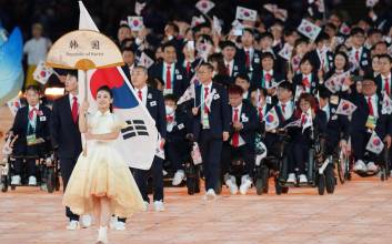 2022 항저우 장애인아시아경기대회(APG)에 나서는 대한민국 장애인 대표팀이 대회 개막식에서 힘찬 발걸음을 내디뎠다. 아시아 장애인 스포츠 선수들의 축제 2022 항저우 APG 개막식이 22일 중국 항저우 올림픽 스포츠센터 스타디움에서 열렸다. 이날 대한민국 대표팀은 알파벳 순서에 따라 44개국 중 15번째로 등장했다. 남색 단복과 붉은색 넥타이를 차려입은 159명의 선수단(선수 71명·경기 임원 59·본부 임원 29명)은 손에 쥔 태극기를 흔들며 경기장을 돌았다. 기수는 여자 골볼 대표팀 주장 김희진(스포츠등급 B2·서울시장애인체육회)과 태권도 간판 주정훈(K44·SK에코플랜트)이 맡았다. 대형 태극기를 나란히 들고 입장한 이들은 선수단 가장 앞에서 힘찬 발걸음으로 나아갔다. 한국이 호명되고 선수단이 무대 중앙에 다다르자, 주정훈은 태극기 끝을 잡고 김희진 주변을 돌며 펄럭이기도 했다. 김희진은 “기수라는 중요한 역할을 맡겨주셔서 영광스럽다. 이번이 세 번째 APG 출전인데 설레고 각오가 남다르다”라고 말했다. 주정훈도 “부담스러운 자리라 많이 떨렸는데, 한국을 대표해서 멋지게 걷고 싶다”라고 기수로 나서는 소감을 전했다. 22일부터 일주일간 열리는 2022 항저우 APG에는 22개 종목에 아시아 44개국 5,121명(선수 3,020명)의 장애인 선수단이 참가한다. 대한민국 대표팀은 이번 대회에서 시각 축구를 제외한 21개 종목에 선수단 348명(선수 208명)을 파견했다. 한국은 이번 대회에서 종합 4위에 오르는 것이 목표다. 금메달은 39개를 예상하고 있다. 직전 대회인 2018 인도네시아 APG에서 금메달 53개·종합 순위 2위를 기록한 것보다 금메달 수와 목표는 하향 조정됐지만, 당시 12개의 금메달을 휩쓴 주력 종목 볼링이 빠진 것을 고려해 조정했다. 패럴림픽에서 9회 연속 금메달 위업을 달성한 보치아와 지난 인도네시아 APG에서 금메달 9개를 따냈던 탁구와 론볼(금메달 7개), 지난 5월 창원에서 열린 장애인사격 월드컵에서 금메달 12개로 종합 우승을 차지한 사격 등에서 많은 메달이 나올 것으로 기대한다.개막식을 마친 대한민국 대표팀은 23일부터 본격적인 메달 사냥에 나선다. 사격과 역도, 육상 및 수영 등에서 메달이 유력한 경기들이 예고돼있다. 메달 효자 종목인 보치아와 배드민턴, 골볼 등도 예선 경기를 통해 금빛 기지개를 켠다. 항저우=윤승재 기자·항저우공동취재단 2023.10.22 22:10