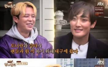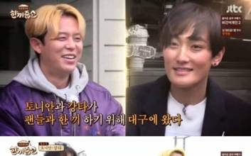'한끼줍쇼' 강타와 토니안이 대구에서의 한 끼에 성공했다.강타·토니안은 21일 방송된 JTBC '한끼줍쇼'에 밥동무로 출연해 대구광역시 대명동에서 한 끼 도전에 나섰다.이날 그야말로 '핫'한 밥동무인 강타와 토니안의 등장에 규동형제도 덩달아 신이 났다. 강타와 토니안은 대구를 찾은 이유로 "예전에 H.O.T. 활동할 때 팬클럽이 있었는데, 대구가 제일 열정적이었다" "최근 타방송국에서 방송된 프로그램 시청률도 대구 쪽이 제일 높게 나왔더라"고 말했다.17년 만에 재결합한 소감도 전했다. 먼저 강타는 "오랜만에 '안녕하세요. H.O.T.입니다'라고 인사를 하는데 뭉클하더라"고 말했다. 토니안 역시 "그날 기억이 사실 없다. 뭘 했는지 정신이 하나도 없었다. 한 달 동안 준비하고 공연을 했는데 너무 빨리 지나가서 끝나니 후유증이 생겼다. 허탈하기도 하더라"고 당시를 떠올렸다.본격적인 도전에 앞서 토니안은 "건방진 얘기일 수도 있는데, 사실 조금 걱정이 된다. 너무 한 번에 성공하지 않을까 싶다. 방송 분량이 나와야 하는데"라고 너스레를 떨었다. 그러면서 "작년에 상도 받고, 올해는 H.O.T. 재결합을 하지 않았냐. 지금 모든 우주의 기운이 제 주위로 오고 있다. 한 번에 성공할 것"이라고 자신감을 드러냈다.호언장담한 것과 달리 토니안은 첫 도전에 실패했다. 연이은 도전에서도 무응답으로 굴욕을 맛봤다. 게다가 한 끼 성공의 달콤함은 토니안이 아닌, 강타 팀이 먼저 맛봤다. 강타와 강호동은 현재 임신 중인 부부의 집에 입성, 미나리 가득한 초록빛 봄철 밥상을 대접받았다. 아내는 강타를 보며 "실제로 원빈 같은데 TV에는 왜 이렇게 안나오냐. 눈이 부시다. 이런 사람을 본 적이 없다"고 감탄해 웃음을 안겼다.이어 토니안과 이경규도 7시 5분경 모자가 함께 살고 있는 집에 입성했다. 고풍스러운 인테리어에 복층 구조가 눈에 띄는 집이었다. 두 사람은 고기와 된장찌개 그리고 대왕 문어로 배를 채웠다. 토니안은 "역시 밥은 집밥이 제일 맛있다. 정말 어머님이 해주시는 집밥은 작년 이후로 처음인 것 같다"고 말했다.정여진 기자 jeong.yeojin@jtbc.co.kr