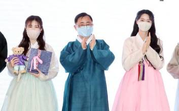 가수 겸 배우 전효성(라카이코리아)이 12일 오후 서울 동대문디자인플라자(DDP)에서 열린 '2021년 봄 한복문화주간' 한복사랑 감사장 수여식에서 오영우 문화체욱관광부 차관과 한복 홍보대사 권나라로부터 감사장을 수여한 후 기념촬영을 하고 있다.사진/영상=김진경 기자 kim.jinkyung@jtbc.co.kr/2021.04.12/ 2021.04.12 17:04
