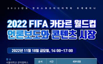 한국스포츠미디어학회(회장 배재성)가 오는 18일 추계세미나를 개최한다.           한국스포츠미디어학회는 "오는 11월 18일(금) 14시 부터 서울대학교 체육문화연구동 206호에서 추계세미나를 개최한다"고 밝혔다.           이번 세미나의 주제는 『2022 FIFA 카타르 월드컵 언론보도와 콘텐츠 시장』이다. 스포츠미디어학회 고문인 정운찬 前총리와 이기흥 대한체육회장, 조현재 국민체육진흥공단이사장이 축사를 맡는다.           이어 유상건 상명대학교 교수가  ‘스포츠기자의 아비투스? 월드컵 보도 현상을 중심으로’를 발제했고, 백정현 KBS 편성본부 스포츠장르 매니저가 ‘메가스포츠 중계와 콘텐츠 유통시장’을 발제한다. 정영재 중앙일보 기자·정형근 SPOTV 기자·박찬민 인하대학교 교수·남상백 한양대학교 교수가 토론에 나서고, 사회는 박지원 우석대학교 교수(1부)와 조욱연 국민대학교 교수(2부)가 맡는다.           배재성 회장은 "이번 세미나를 통해 다음주 개막 예정인 2022 FIFA 월드컵과 관련된 다양한 이슈와 메가스포츠 이벤트 등에 대한 유익하고 발전적인 고견들이 나올 것으로 기대한다"며 세미나의 의의를 밝혔다.           세미나 녹화 영상은 오는 19일부터 학회 공식 유튜브채널에서 확인할 수 있다.             김우중 기자