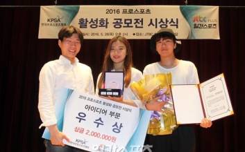 '건전 스포츠 제대로, 행복 스포츠 대대로.'(사)한국프로스포츠협회(KPSA·회장 권오갑)와 일간스포츠(대표이사·홍성완)가 공동으로 주최한 ‘2016 프로스포츠 활성화 공모전’의 시상식이 26일 오후 2시 서울 마포구 상암동 JTBC 빌딩 2층 대강당에서 성황리에 개최됐다.이번 공모전은 ▲프로스포츠 관람문화 확산 ▲지역과 함께 하는 프로스포츠 ▲프로스포츠의 불법, 부정행위 근절 등 총 3개 부문을 세부 주제로 '프로스포츠 활성화'에 대한 다양한 아이디어와 창의적인 콘텐츠를 찾기 위해 기획됐다. 국내 대학생 및 대학원생(박사과정 제외)과 일반인을 대상으로 한 이번 공모전에는 ▲아이디어(33편) ▲UCC(12편) ▲표어/슬로건(550편) 등 3개 부문에 총 595편의 작품이 출품됐다.전반적으로 프로스포츠 활성화를 위한 상큼한 아이디어가 많았다. 그 중에서도 표어/슬로건 부문 우수상을 수상한 '건전 스포츠 제대로, 행복 스포츠 대대로'는 최근 국내 프로스포츠의 당면 과제를 표어로 풀어낸 작품으로 시사하는 바가 크다.공모전의 총상금은 2390만원으로 부문별 ▲최우수상(300만원·표어/슬로건 100만원) ▲우수상(200만원·표어/슬로건 70만원) ▲장려상(100만원·표어/슬로건 50만원)으로 나눠 시상했다.아이디어 부문은 최우수상 선정작 없이 우수상 2편과 장려상 3편이 선정됐다. 우수상에는 ‘그라운드에서 세잎클로버를 발견한다’라는 제목으로 프로스포츠의 불법, 부정행위 근절 아이디어를 제시한 세잎클로버팀(계명대 광고홍보학과)과 ‘스마트폰 어플리케이션을 활용한 스포츠 관람객 유치 아이디어’를 출품한 변현(30·연세대·스포츠레저 전공 석사과정)씨가 영예를 안았다.아이디어 부문 장려상에는 '자전거를 활용한 쾌적한 관람문화를 장려한다'는 내용을 출품한 스맥스팀(SMAX·남서울대 스포츠비즈니스학과), '미디어를 통해 보는 스포츠가 아닌 경기장에 직접 찾아가 즐기는 스포츠 문화'를 강조한 하트 비트팀(Heart Beat·계명대 정치외교학과), '포토티켓을 활용해 스포츠 관람 문화를 확산하자'는 내용을 제출한 나혜선(25·고려대 교육학과)씨가 각각 수상자로 선정됐다.UCC 부문 최우수상의 영예는 심현보(24·연세대 기계공학과)씨에게 돌아갔다. '행복 추구를 위한 방안으로 프로스포츠 관'람을 제시하며 프로스포츠의 순기능과 긍정성을 강조했다. 우수상에는 직접 제작한 음악을 입혀 프로스포츠의 긍정적 이미지를 참신하게 나타낸 송은석(27·명지대 경영학과)씨, '보러 가자'라는 메시지를 부각시키며 프로스포츠 관람문화 확산을 강조한 통일연세막강체육팀(연세대 체육교육학과)이 기쁨을 누렸다.불법 프로스포츠의 도박성과 중독성을 경고한 코이팀(Koi·안양대 디지털미디어디자인학과), 어린이부터 직장인까지 모두에게 즐거움을 선사하는 것이 프로스포츠의 역할이라고 표현한 안병주(24·성균관대 스포츠과학과)씨, 스포츠 관람률을 높이기 위한 방안을 제시한 세친구팀(우송대 미디어디자인학과)은 각각 UCC 부문 장려상을 수상했다.일반인 참가도 가능했던 슬로건 부문에서는 '프로스포츠의 愛너지! 건전한 여가의 始너지!'를 제출한 신연호(49)씨 작품이 최우수상을 받았다. 신씨는 함께 출품한 '함께 즐기는 프로스포츠, 함께 나누는 행복愛너지'도 우수상에 선정되어 2관왕을 차지했다.이 밖에 '건전 스포츠 제대로, 행복 스포츠 대대로'를 출품한 김태훈(23·명지대 정치외교학과)씨도 우수상을 받았다. 장려상에는 이종근(51)씨의 '사심 없는 게임 OK! 사행심 조장 KO!', 강준호(45)씨의 '승부는 정당하게! 승리는 당당하게!', 고민정(33)씨의 '프로스포츠 즐기GO! 건전여가 이루GO!'가 각각 영예를 안았다.이번 공모전 수상작은 향후 프로스포츠 활성화와 공정성 확보를 위해 적극 활용될 예정이다. 또한 프로스포츠 경기장 전광판과 SNS 공식채널 등 다양한 루트를 통해 새로운 스포츠 문화의 가치를 정착시키는데 이용될 계획이다.KPSA 박재영 사무총장은 "가맹단체들과 함께 미래의 프로스포츠를 이끌어나갈 세대들의 참신한 아이디어를 통해 국내 프로스포츠 다양한 분야의 발전을 모색하고, 스포츠의 기본 가치인 공정성 확립으로 프로스포츠의 인식을 개선해 나가고자 공모전을 개최했다"고 설명했다. 서지영 기자 2016.05.27 06:00