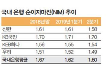한국은행이 기준금리를 또 다시 낮춰 ‘역대 최저’ 금리 연 1.25%를 기록했다. 은행들이 또 한 번의 금리조정에 들어가야 할 상황에 맞닥뜨렸다. ‘수익성 악화’가 불가피하다며 실적 잔치는 끝났다는 ‘앓는 소리’도 나온다. 22일 금융감독원에 따르면 국내 시중은행의 수익성 지표인 순이자마진(NIM)은 지난해 말 1.67%에서 올 2분기 말 1.61%로 하락했다. 4대 은행만 봐도 신한·국민·우리·하나은행의 2분기 NIM은 1.49∼1.70으로, 1분기(1.52∼1.71)보다 상단과 하단이 각각 0.01%포인트, 0.03%P 떨어졌다. 7월 기준금리 인하 효과를 반영하면 3분기 말 NIM은 1.5% 안팎일 것이라는 전망이 나온다.은행 관계자는 “올해 7월에 이은 10월 금리 인하로 은행권 NIM은 3분기에 이어 4분기에도 축소가 불가피해 보인다”고 말했다. 게다가 경기 부양 측면에서 추가 금리 인하 주장이 더욱 힘을 얻고 있어 은행은 저성장·저수익 국면으로 들어설 것이라는 우려도 등장했다. 금리가 내려가면 수신·대출금리가 모두 떨어지면서 은행의 이자수익은 줄어들게 된다. 이에 은행들은 대출을 늘려 수익성 방어에 나서는 모양새다. 기업 대출, 특히 중소기업대출을 확대하는 추세다. 중소기업 대출은 지난해 8월 405조178억원, 11월 415조4884억원, 올해 2월 418조8171억원, 5월 426조9055억원, 6월 428조8491억원, 7월 431조4008억원, 8월 434조510억원으로 꾸준히 늘고 있다. 중소기업 대출의 확대는 정부 정책, 기업과 은행의 요구가 맞아떨어진다. 정부가 중소기업 육성을 위해 대출 등 금융지원을 적극 권장해왔고, 현금성 자산이 부족한 중소기업은 대출 수요가 많기 때문이다. 더구나 금융당국이 내년부터 예대율(예금 대비 대출금 비율)을 산정할 때 가계대출 가중치는 15%P 높이고 기업 대출 가중치는 15%P 내리기로 하면서, 은행들이 예대율 가중치가 낮은 중소기업 대출에 공격적으로 나서고 있다. 하지만 이마저도 마냥 늘리기는 어렵다. 대기업들은 은행에서 자금 조달을 하지 않고 있고, 개인사업자를 포함한 중소기업 대출은 경쟁이 심한 데다 상대적으로 리스크가 높다. 실제로 주요 시중은행의 연체율은 올들어 상승세를 보이기도 했다. 은행 상반기 이자이익만 20조원…"실적 잔치 꺾이지 않을 것" NIM 하락에 더해 마땅한 수익원도 찾지 못한 은행권의 이익 상승세가 꺾일 것이라는 분위기가 감지되고 있다. 하지만 업황부진에 따른 실적악화의 칼날이 유일하게 빗겨간 은행들의 ‘실적 잔치’가 쉽게 꺾이지 않을 것이라는 목소리도 있다. 이미 올 상반기 국내 은행의 당기순이익은 총 8조7000억원으로 전년 동기(8조3000억원) 대비 4000억원 증가했다. 이자이익만 20조원 가량을 벌어들인 데다, 금리 하락에 따라 은행이 보유한 채권 가치가 올라가면서 비이자이익도 1조원 증가했다. 신한·국민·하나·우리·농협 등 5대 은행의 상반기 순익은 5조7123억원으로 그룹 전체 순익의 80.09%에 달했다. 국민은행이 1조3051억원의 가장 많은 순익을 냈고, 신한은행(1조2818억원), 우리은행(1조2460억원), 하나은행(1조338억원), 농협은행(8456억원)이 뒤를 이었다. 주력계열사인 은행의 호실적에 힘입어 5대 금융그룹의 상반기 성적도 역대급을 기록했다.올 상반기 금융그룹 1·2위 실적을 올린 신한·KB금융은 각각 1조9144억원, 1조8368억원의 순익을 거뒀고, 3·4위를 차지한 하나·우리금융은 1조2045억원, 1조1790억원이었다. 농협금융의 순익은 9971억원을 기록, 농협금융 출범 이후 사상 최대 실적을 냈다. 신한금융은 상반기 최대 실적을 갈아치웠고, KB금융도 2분기로는 역대 최대치를 찍었다.우리금융의 순익은 경상 기준으로 상반기 최대 수준이었고, 하나금융은 상반기에 이자이익과 수수료 이익을 합한 ‘핵심이익’이 최대치를 기록했다. 금융권 관계자는 “금융지주가 올해 연간 기준 11조원대 실적을 돌파할 것이라는 전망이 나온다”며 “다만 여전히 주요 계열사인 은행의 이자이익에 실적을 기대는 측면이 크고, 증권·보험·카드 등 다른 계열사의 수익이 은행에 비해 크게 못 미쳐 새로운 먹거리 찾기가 반드시 필요하다”고 말했다. 권지예 기자 kwon.jiye@joongang.co.kr 2019.10.23 07:00