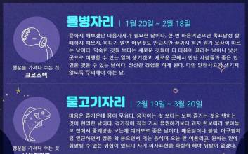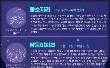 자료제공 : 점신 물병자리 (1.20 ~ 2.18) 똑!소리 나는 모습을 보여줄수록 당신에게 유리한 날이다. 당신을 만만하게 보는 사람들에게 예리하고 샤프한 모습을 보여주자. 원하는 것을 얻을 수 있는 날이다. 우유부단한 모습을 보이면 괜스레 엉뚱한 일에 휘말릴 수 있으니 당신의 의견을 확실히 이야기 할 것. 충동적인 결정 보다는 논리적인 사고가 필요한 날이니 이것저것 재보고 판단하자. 얼렁뚱땅 넘어가면 본전도 못 찾는다. 행운을 가져다 주는 것 : 신문 물고기자리 (2.19 ~ 3.20) 청소하기 좋은 날! 평상시 신경을 못 쓰던 집안 구석구석 깨끗이 정리해 볼 필요가 있는 날이다. 주변 환경이 정리됨과 동시에 머릿속, 맘속에 있던 어지러운 것들도 말끔해 질 수 있겠다. 기계, 공구 등을 사용하여 못을 박거나 손볼 곳을 건드려도 좋다. 단, 말끔하게 마무리 할 것. 액자를 사서 걸거나 식탁보를 바꾸는 등 간단한 소품으로 집안 분위기를 바꿔보는 것도 좋다. 오늘 당신의 미적 센스는 제법 훌륭하다. 행운을 가져다 주는 것 : 꽃무늬 벽지 양자리 (3.21 ~ 4.19) 사소한 것에 목숨걸지 말자! 작은 것들은 그냥 넘기고 큰 것을 생각해야 하는 날이다. 작은 약속 때문에 큰 계획에 차질을 빚는 일들이 없도록 하자. 통 크게 일한다고 대강하다간 큰코다친다! 건망증 때문에 실수가 있을 수 있는 날이니 조심하자. 요즘 남친, 여친의 심기가 불편한 것 같단 생각이 들진 않았는지? 오늘 큰맘먹고 근사한 저녁 한 번 쏘자. 관계가 좋아진다. 주변에서 괜시리 참견하려는 사람들이 있다면 오늘은 좋다. 어부지리로 얻는 것들이 있을 것이니~ 행운을 가져다 주는 것 : 초콜릿 아이스크림 황소자리 (4.20 ~ 5.20) 당신의 레이더망에 들어온 누군가가 있다면? 우물쭈물 요것조것 따져보는 사이에 다른 사람이 홱 채갈 수 있다. 망설임은 청춘사업 신장개업에 가장 큰 적! 짝꿍이 없는 당신이라면 오늘, 용기를 내보자. 한번 쯤 대쉬해 봐도 좋은 날이다. 단, 즉흥적으로 기분에 젖어 하는 고백이라면 창피만 당할 수 있겠다. 연인이 있는 당신이라면 오늘 그/그녀와의 근사한 저녁데이트가 있겠으니 미리 준비하자. 행운을 가져다 주는 것 : 샐러드 쌍둥이자리 (5.21 ~ 6.21) 그동안 바쁘다고 미뤄왔던 일들을 한꺼번에 해결해보자. 그래도 되는 날이거든^^ 당신의 미래에 대해 불분명하다면 짧게는 한 달부터 길게는 10년 20년 까지 장기 계획을 세워보자. 앞으로 목표를 이루기 위해 당신이 해야 할일들을 생각해보고 지금까지 얼 만큼 이뤄냈는지 체크해 보도록 하자. 아무것도 이룬 게 없다고 우울해 할 것 없다. 당신에게 지나간 과거보다 앞으로의 미래가 더 많이 남아 있기 때문에. 행운을 가져다 주는 것 : 검은색 상의 게자리 (6.22 ~ 7.22) 주변의 의견을 수렴해야 하는 날이다. 당신의 강압적인 진행이 다른 사람들의 불만을 사고 있다는 것을 깨달아라. 늘 그랬던 것처럼 술 마시고 어영부영 넘어가려 한다면 오히려 더 많은 반감을 사게 될 것이다. 주변의 상황을 잘 따져보고 당신의 진행이 너무 욕심이 아닌지 잘 파악해보자. 그렇지 않다면 주변 사람들을 잘 설득시킬 방법을 생각해보는 것이 좋을 듯하다. 그렇다고 포기하고 그만둔다면 틀어진 관계를 회복하기가 더욱 힘들어질 것이다. 용기를 갖자! 행운을 가져다 주는 것 : 참외 사자자리 (7.23 ~ 8.22) 콩다방에서 까페라떼를 주문하고 시럽으로 입맛을 맞추는 당신. 오늘은 웬만하면 그냥 마시기를 권한다. 담백한 아메리카노~를 추천한다. 시럽이 필요한 당신은 수전증으로 인해 커피가 아니라 설탕물을 먹게 될지도 모르니까. 어느 정도 타협할 수 있다고 생각하면 오늘은 욕심내지 말고 이래도 좋고, 저래도 좋은 그런 스타일을 추구하는 게 좋겠다. 그게 오래 살 길. 때로는 사람이 물 흐르듯 살아갈 필요도 있다. 똑! 하고 부러질 수도 있거든. 행운을 가져다 주는 것 : 숭늉 처녀자리 (8.23 ~ 9.23) 기브 앤 테이크 정신에 오늘은 테이크에 밑줄 쫙~ 베풀고 행하는 만큼 두배 세배 돌아오는 날이다. 마음을 여유롭게 갖고 당신의 도움이 필요한 곳에 선심쓰도록 하자. 돈과 관련한 모든 일을 삼가자. 내기, 거래 기타 등등 하물며 버스카드 환승적용이 제대로 되지 않아 두배의 버스요금을 물 수도 있을 만큼 금전운이 좋지 못하다. 짝꿍이 없는 솔로인 당신이라면 오늘 새로운 인연을 만날 운이 있다. 적극적으로 자신을 내세우는 것이 관건이다. 행운을 가져다 주는 것 : 영어스터디 천칭자리 (9.24 ~ 10.22) 게으름을 피우고 싶지만 오늘은 스톱! 휴식보다는 일에 몰두해야 하는 날이다. 원인 없는 결과는 없는 것이니, 나중에 가서 후회 말고 마음을 다잡아 부지런을 떨어보자. 나중에 원망할 사람은 자신밖에 없으니. 어설픈 핑계를 댔다간 망신살이 뻗칠 수 있겠다. 자잘못을 가릴 일이 있다면 자신의 잘못을 명백히 시인하고 대안을 제시할 것, 남의 탓으로 돌렸다가 실속도 못 차리고 이미지만 버릴 수 있겠다. 즉흥적인 언행을 자제하고 흥분하지 말 것! 행운을 가져다 주는 것 : 패션양말 전갈자리 (10.23 ~ 11.22) 사람과의 관계에 속 썩는 날이다. 필요이상의 자존심은 자제해야 원하는 결과를 얻을 수 있겠다. 여