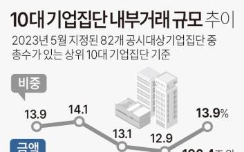 상위 10대 기업집단의 지난해 내부 거래금액이 최근 5년 중 가장 큰 규모로 증가했다. 여기에 총수 일가의 지분율이 높을수록 회사 내부거래 비중도 증가하는 흐름이 나타났다. 11일 공정거래위원회가 발표한 '공시대상기업집단 내부거래 현황'에 따르면 올해 5월 지정된 82개 공시대상기업집단의 지난해 국내외 계열사 전체 내부거래 비중은 33.4%, 내부거래 금액은 752조5000억원으로 집계됐다. 국내 계열사 간 내부거래 비중은 12.2%(275조1000억원), 국외 계열사의 내부거래 비중은 21.2%(477조3000억원)로 파악됐다.총수가 있는 상위 10대 집단(삼성, SK, 현대자동차, LG, 롯데, 한화, GS, HD현대, 신세계, CJ)의 국내 계열사 간 내부거래 금액은 196조4000억원이었다. 2021년(155조9000억원)과 비교하면 1년 만에 40조5000억원 늘었다. 10대 집단의 구성이 지난해와 동일했던 최근 5년 가운데 가장 큰 폭의 증가다.이들의 내부거래 비중은 13.9%로 공시 대상 집단 내부거래 비중(12.2%)보다 1.7% 높았다. 전년과 비교해도 1.0% 증가했다.기업별로 보면 내부거래 비중이 전년 대비 가장 많이 증가한 곳은 SK(4.6%)였다. 지난해 국제유가 상승 국면에서 SK에너지의 계열사 매출이 큰 폭으로 증가한 영향 때문으로 분석되고 있다. 최근 5년간 내부거래 비중이 가장 많이 증가한 집단은 현대자동차(2.6%)였다. 글로벌 완성차 판매 시장이 호조를 띠면서 수출 완성차에 들어가는 부품 계열사들의 매출이 증가한 영향이라는 게 공정위의 설명이다.국내외 계열사 전체 내부거래 비중이 가장 높은 집단은 셀트리온(62.5%) 이었고, 한국타이어(62.4%)와 삼성(58.3%)이 뒤를 이었다.