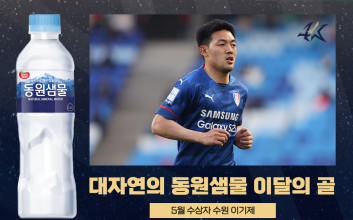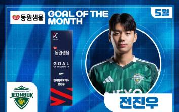 전북 현대 전진우가 2025시즌 5월 K리그 ‘안심을 마시다 동원샘물 이달의 골’을 수상했다. K리그 5월의 선수상까지 차지한 그는 본인이 왜 대세인지를 증명했다.동원F&B가 후원하는 ‘안심을 마시다 동원샘물 이달의 골'은 매월 가장 인상 깊은 득점을 터뜨린 선수에게 수여하는 상이다. 두 명의 후보를 대상으로 K리그 멤버십 어플리케이션 ’Kick’을 통한 팬 투표를 진행해 수상자를 결정한다. 투표는 가입자당 기간 내 1일 1회씩, 총 3회 참여할 수 있다.5월 ‘이달의 골’은 K리그1 11~17라운드 경기를 대상으로 했고, 후보는 전북 전진우와 포항 스틸러스 이호재였다.전진우는 16라운드 대구전에서 후반 20분 날카로운 돌파로 상대 수비를 무너뜨린 후 강력한 오른발 슛을 성공시키며 상대 골문을 갈랐다. 이호재는 13라운드 수원FC전에서 후반 시작 직후 강력한 터닝슛을 꽂아 넣으며 5월 이달의 골 후보에 올랐다.‘Kick’ 팬 투표는 이번 달 11일(수)부터 13일(금)까지 3일간 실시했다. 그 결과 전진우가 6614표(80%)를 받아 1700표(20%)를 받은 이호재를 제치고 ‘5월 이달의 골’을 차지했다. 전진우에게는 상금 100만 원과 함께 트로피가 주어진다. 연맹은 올 시즌부터 이달의 골 수상자의 친필 사인을 받은 레플리카 트로피를 제작해 기부 경매를 진행하고 있다.동원F&B의 먹는샘물 브랜드 동원샘물은 경기도 연천군, 충북 괴산군, 전북 완주군 등의 청정지역 심층 암반수를 취수해 천연 미네랄이 풍부한 친환경 생수다. 동원F&B는 자체 캐릭터인 ‘건강수’를 통해 SNS에서 MZ세대와 소통하고 있으며 공병 경량화, 무라벨 도입 등 친환경 요소를 강화하는 ESG 경영에도 앞장서고 있다.김희웅 기자