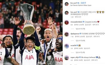 2010년 함부르크(독일)에서 프로에 데뷔한 손흥민은 15년 만에 커리어 첫 우승을 달성했다. 기나긴 무관 늪에서 벗어났다.그라운드에서 태극기를 몸에 두르고 동료, 팬들과 기쁨을 나눈 손흥민은 SNS에 게시물을 올리기 시작했다.첫 게시물에 달린 동료들의 반응도 폭발적이다. 팀 동료인 제드 스펜스는 욕설을 섞어 “레전드”라며 손흥민을 축하했다. 마티스 텔도 ‘왕관’ 이모지로 박수를 보냈다.과거 토트넘에서 한솥밥을 먹었던 무사 뎀벨레도 “축하해 형제”라며 축하 메시지를 띄웠다. 전 동료인 카일 워커 피터스(사우샘프턴)도 “자랑스럽다 브로”라며 축하했다.