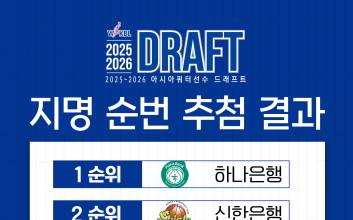 여자프로농구 부천 하나은행이 아시아쿼터 선수 드래프트 전체 1순위 지명권을 손에 넣었다.여자프로농구연맹(WKBL)은 28일 "이날 오전 WKBL 사옥 1층에서 진행된 2025~26 WKBL 아시아쿼터 선수 드래프트 지명 순번 추첨식에서 하나은행이 전체 1순위 지명권을 획득했다"라고 밝혔다.이번 드래프트 지명권 추첨은 지난 시즌 성적에 따라 1그룹과 2그룹으로 나눠 추첨했다. 1그룹엔 정규리그 6위 하나은행과 5위 인천 신한은행이 각각 50%의 1순위 지명권 획득 확률을 보유했다. 3~6순위 지명권을 가리는 2그룹은 정규리그, 포스트시즌 성적에 따라 청주 KB각 3순위 지명권 획득 확률 50%, 이어 용인 삼성생명(35%) 아산 우리은행(10%) 부산 BNK(5%) 순으로 추첨을 진행했다.추첨 결과 2순위는 신한은행이 차지했고 3순위는 KB, 4순위 우리은행, 5순위 삼성생명, 6순위 BNK 썸이 지명권을 나눠갖게 됐다. 이번 아시아쿼터 선수 드래프트에는 지난해보다 6명 늘어난 18명이 신청했다. 지난 시즌 WKBL을 누빈 경력자 5명도 다시 한국 코트 입성을 노린다. BNK서 창단 첫 챔피언결정전 우승에 기여한 이이지마 사키가 2년 연속 지원했다. 히라노 미츠키(전 삼성생명), 스나가와 나츠키(전 우리은행), 시다 모에(전 KB), 이시다 유즈키(전 하나은행)도 2년 연속 참가한다.