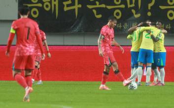 한국 남자 축구대표팀이 국제축구연맹(FIFA) 랭킹 6위 브라질의 높은 벽을 실감하고 있다. 이미 전반을 2골 뒤진 채 마쳤던 대표팀은 후반 4분 만에 내리 실점을 허용했다.홍명보 감독이 이끄는 대표팀은 10일 오후 8시부터 서울월드컵경기장에서 브라질과 10월 A매치 친선전을 진행 중이다. 대표팀은 FIFA 랭킹 23위로, 세계적 강호 브라질과 만나 백3 전술을 꺼내 들어 맞서고 있다.이 경기는 2026 FIFA 북중미 월드컵 본선 진출을 확정한 두 팀의 스파링으로 눈길을 끈다. 두 감독은 1군 정예 멤버를 모두 내세워 팬들의 기대에 부응했다.대표팀은 이날 적절한 압박과 내려앉는 수비로 브라질에 맞섰으나, 전반에만 2골을 실점하며 끌려갔다. 전반 13분 브루노 기마랑이스의 침투 패스를 받은 이스테방이 가볍게 선제골을 넣었다. 이어 전반 막바지 호드리구가 절묘한 드리블과 오른발 슈팅으로 골망을 흔들었다.0-2로 뒤진 채 맞이한 후반전, 홍명보 감독은 황인범 대신 옌스 카스트로프를 투입하며 변화를 줬다. 하지만 대표팀은 후반 4분 만에 2골을 더 실점했다.먼저 후반 2분 후방 빌드업 중 김민재가 균형을 잃고 넘어져 허무한 패스 실수를 범했다. 이를 가로챈 이스테방이 왼발 슈팅으로 마무리했다.실점은 이어졌다. 이번에는 중원 경합에서 패한 대표팀이 브라질의 역습을 맞이했다. 후반 4분 비니시우스 주니오르의 패스를 받은 호드리구가 가볍게 차 넣으며 4골 차로 달아났다.후반 8분까지 0-4로 뒤진 대표팀은 침착하게 점유율을 늘리며 브라질에 맞서고 있다.상암=김우중 기자 2025.10.10 21:17