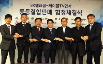- 13일 서울 서대문 한국케이블TV방송협회에서 SK텔레콤과 6개 케이블 사업자는 동등결합 상품인 ‘온가족케이블플랜’(가칭) 출시를 위한 공식 협정을 체결하고 손을 맞잡고 있다. 왼쪽부터 딜라이브 전찬호 실장·CMB 심탁곤 상무·티브로드 정우용 상무·SK텔레콤 임봉호 본부장·현대 HCN 조석봉 상무·JCN 울산중앙방송 김기하 국장·CJ헬로비전 이영국 상무. SK텔레콤 제공 내년 2월 SK텔레콤의 이동통신 상품과 CJ헬로비전 등 종합유선방송사업자(SO)의 케이블TV 상품을 묶은 방송·통신 결합상품이 나온다. SK텔레콤과 6개 케이블 사업자는 동등결합 상품인 ‘온가족케이블플랜’(가칭) 출시를 위한 공식 협정을 체결했다고 13일 밝혔다.6개 케이블 사업자는 CJ헬로비전·티브로드·딜라이브·현대HCN·CMB·JCN울산중앙방송이다.이번 협정에 따라 향후 사업자 전산개발 및 정부의 인허가 절차 등을 거쳐 내년 2월 본격적인 동등결합 상품 출시가 가능할 전망이다. 결합에 따른 고객 할인 혜택은 SK텔레콤이 운영 중인 ‘온가족플랜’과 유사한 수준이다.동등결합은 모바일 서비스를 보유하지 않은 케이블TV 사업자가 자사 방송·통신 상품 가입자에게 이동통신 사업자의 모바일 서비스를 결합해 사용할 수 있도록 하는 것이다.케이블TV 사업자들은 지난 8월 결합상품 시장에서 모바일을 보유하지 않아 경쟁력이 약하다는 이유로 SK텔레콤에 동등결합 상품 출시를 공식적으로 요청했다. 이후 양측은 동등결합상품 구성 및 이용조건, 상품 출시 일정 등 동등결합 제공을 위한 세부사항에 대해 폭넓은 협의를 지속해왔다.미래창조과학부는 사업자 간 동등결합 협정에 대한 실효성을 높이기 위해 이날 ‘방송·통신 동등결합 판매 가이드라인(안)’을 발표했다. 동등결합의 원칙·방법·절차 등에 대한 기준과 거래대가 산정 등 거래조건에 관한 사항 등을 담았다. 이에 따르면 제공사업자(SK텔레콤)는 케이블TV 사업자들에게 동등결합을 제공할 때 계열사(SK브로드밴드)에 제공하는 것에 비해 제공대가 등 거래조건을 정당한 이유없이 차별할 수 없다.권오용 기자 bandy@joongang.co.kr 2016.12.13 17:44