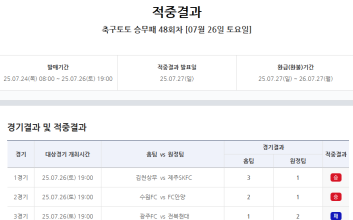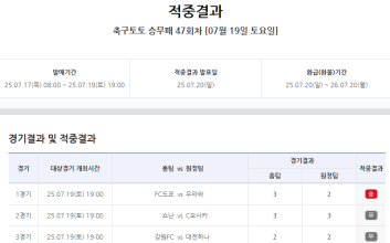 축구토토 승무패 47회차에서도 적중자가 나오지 않으면서, 3회 연속 누적된 약 17억 원의 1등 상금이 차하위 등위 적중자들에게 분배됐다.서울올림픽기념국민체육진흥공단(이사장 하형주)이 발행하는 체육진흥투표권 스포츠토토의 수탁사업자 한국스포츠레저㈜가 지난 7월 19일부터 20일까지 진행된 국내 프로축구(K리그) 및 일본 프로축구(J리그) 14경기를 대상으로 한 축구토토 승무패 47회차의 적중 결과를 20일 발표했다. 앞선 축구토토 승무패 44~46회차에서는 적중자가 연이어 나오지 않아, 총 17억 4,958만 9,000원의 1등 적중금이 누적된 상태였지만, 이번 47회차에서도 적중자는 끝내 나오지 않았다. 이로 인해 위 금액은 규정에 따라 2~4등 적중자들에게 각각 분배됐다.스포츠토토 승무패 게임은 1등 당첨자가 없을 경우 상금이 최대 3회까지 이월되며, 이후에도 1등이 없으면 누적 상금은 그 회차의 하위 등위 적중자에게 배분된다.이 결과, 이번 회차에서는 2등 당첨자 20명이 각각 1억 7,699만 7,990원을 수령하게 됐고, 3등은 62만 5,350원(409건), 4등은 12만 9,440원(3,952건)이 지급됐다. 총 4,381건의 적중에 대해 지급될 예정인 총 환급금은 모두 43억 727만 4,830원으로 집계됐다.무승부 결과가 변수로 작용한 축구토토 승무패 47회차…48회차는 K리그 빅매치 다수 포함 축구토토 승무패 47회차 최종 결과에서는 승(홈팀 승) 7경기, 무(양팀의 무승부) 3경기, 패(원정팀 승)가 4경기였다. 홈팀이 대체로 강세를 보인 가운데, 쇼난-C오사카(3-3)전을 비롯해, 강원FC-대전하나시티즌(2-2), 김포FC-안산그리너스(2-2)전 등 일부 경기에서는 무승부가 나오며 승부 예측의 변수로 작용했다.다음 회차인 축구토토 승무패 48회차는 오는 7월 24일 오전 8시에 발매를 개시해, 오는 26일 오후 7시까지 전국 스포츠토토 판매점 및 공식 인터넷 발매사이트 베트맨을 통해 구매할 수 있다. 해당 회차는 국내 프로축구(K리그) 및 일본 프로축구(J리그) 경기를 포함한 총 14경기를 대상으로 진행된다. 주요 경기로는 ▲김천상무-제주유나이티드(1경기) ▲광주FC-전북현대(3경기) ▲강원FC-울산HDFC(9경기) ▲대전하나시티즌-FC서울(10경기) ▲대구FC-포항스틸러스(11경기)전 등이 포함됐다.한국스포츠레저 관계자는 “이번 회차는 3회 연속 이월 후에도 1등 당첨자가 없어, 상금이 차하위 등위에 분배됐다”며 “새롭게 시작하는 48회차에도 많은 관심과 참여를 부탁한다”고 밝혔다. 한편, 구매자는 투표권 우측 상단에 인쇄된 QR코드를 스마트폰으로 스캔하면, 별도 로그인 없이 적중 여부를 간편하게 확인할 수 있다. 축구토토 승무패 47회차 적중결과 및 48회차 대상경기 정보는 베트맨과 토토가이드 페이지를 통해 확인할 수 있다. 안희수 기자 2025.07.21 13:04